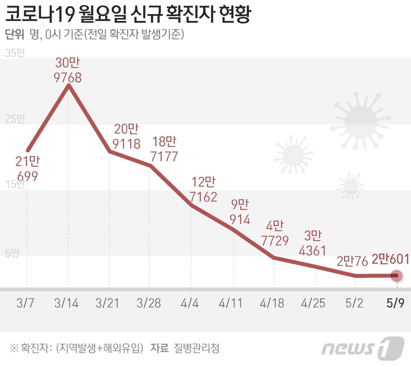 2만601명 확진…위중증 421명·사망 40명전날 이어 1주전 비해 확진자 '소폭' 증가질병관리청 중앙방역대책본부(방대본)는 9일 0시 기준 신종 코로나바이러스 감염증(코로나19) 신규 확진자가 2만601명 발생했다고 밝혔다. ⓒ News1 김초희 디자이너ⓒ News1 김초희 디자이너9일 질병관리청 중앙방역대책본부에 따르면 이날 0시 기준 국내 코로나19 누적 확진자는 2만601명 증가한 1756만4999명으로 나타났다. ⓒ News1 윤주희 디자이너관련 키워드코로나19코로나권영미 기자 다카이치 日총리 장남, 중의원 출마 결심…내달 조기총선 유력베네수엘라 증시, 마두로 체포 열흘만에 160% 폭등…경제회복 기대강승지 기자 예방 가능한 외상사망률 2년만에 13.9%→9.1%…한 자릿수 진입의대교수협 "증원 효과 10년 뒤 나타나…수가 정상화 등이 먼저"관련 기사박용선 경북도의원 "시민 행복·경제 회복 위해 포항시장 출마"원화 약세 배경은 통화량? 한국 GDP 대비 M2 153.8%, 미국의 2배작년 취업자 19.3만명↑…청년 실업률 6.1%·건설 12.5만명↓ '한파'(종합2보)국립보건연구원, 소아 마이코플라스마 폐렴 치료제 효과 비교 임상 개시지난해 취업자 19.3만명↑…청년 실업률 6.1% 팬데믹 이후 최고(종합)