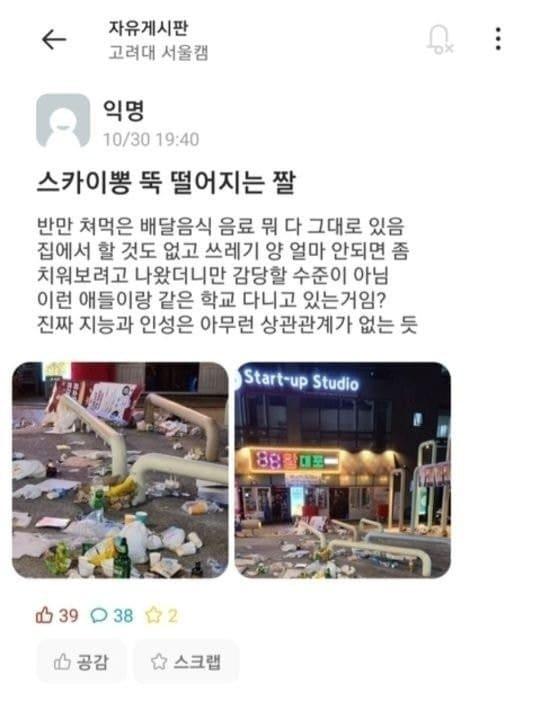축제 끝난 고대 '쓰레기 몸살'…"스카이뽕 뚝" 일침에 학생들 정리 '싹'