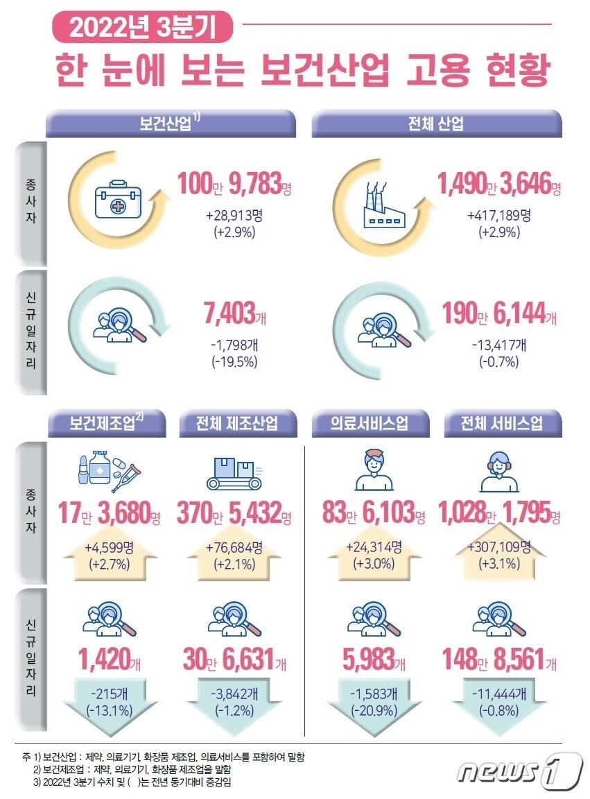 보건산업진흥원 '3분기 보건산업 고용동향'…총 101만명3분기 신규 일자리 7403개…의료서비스 분야 81%2022년 3/4분기 보건산업 고용동향 (한국보건산업진흥원 제공)강승지 기자 "EMR 인증제 개선, 의료 정보교류·AI 스타트업 지원 강화"예방 가능한 외상사망률 2년만에 13.9%→9.1%…한 자릿수 진입