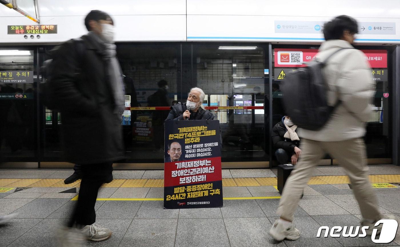 박경석 전국장애인차별철폐연대(이하 전장연) 대표가 5일 오전 서울 지하철4호선 혜화역에서 열린 장애인 권리 예산 확보를 위한 선전전에서 발언을 하고 있다. 전장연은 오세훈 서울시장 면담을 요구하며 오는 19일까지 지하철 승하차 시위를 중단하기로 했다. ⓒ News1
