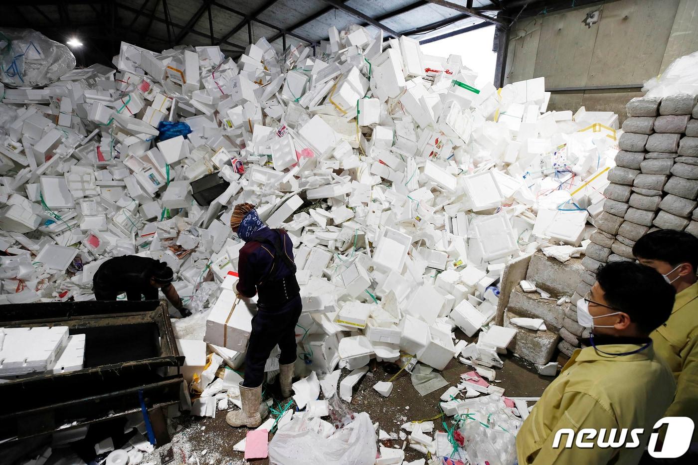 광주 북구 재활용선별장에서 택배포장 스티로폼과 일회용품 등에 대한 분리수거 작업이 이뤄지고 있다. ⓒ News1