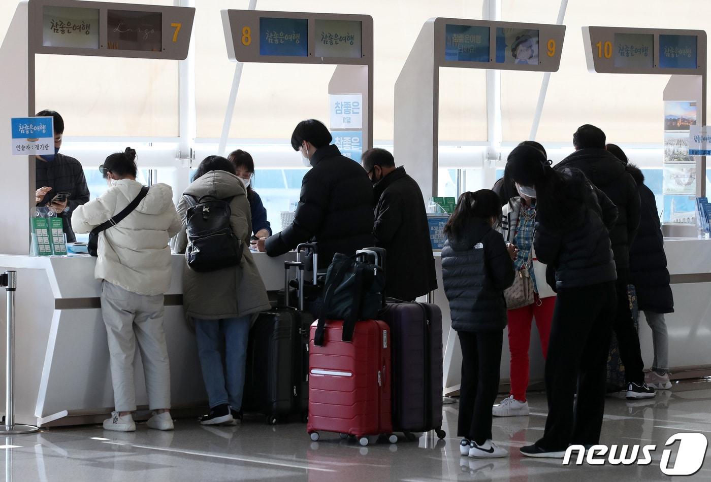 지난 18일 오후 인천국제공항 제1터미널 출국장 여행사 카운터에서 여행객들이 출국 전 안내를 받고 있다. 2023.1.18/뉴스1 ⓒ News1 구윤성 기자