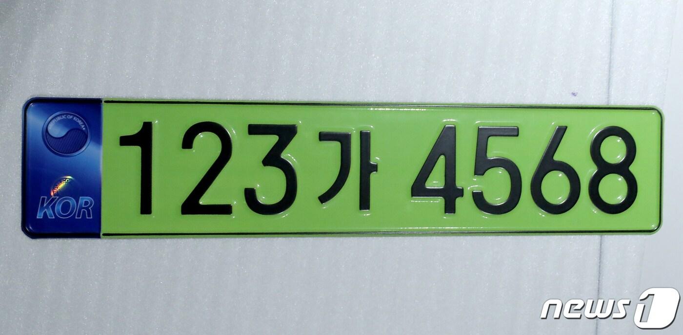 지난달 31일 서울 서초구 한국자동차산업협회에서 열린 법인승용차 전용 번호판 도입방안 공청회에서 녹색으로 만들어진 법인 승용차 번호판이 소개됐다. 윤석열 대통령은 대선 당시 법인 승용차의 사적 남용을 방지하기 위해 개인 소유 일반 승용차 등과 구분하겠다고 공약, 국토교통부가 공약 실행을 위해 오는 7월부터 법인 전용번호판 제도를 시행키로 했다. ⓒ News1 장수영 기자