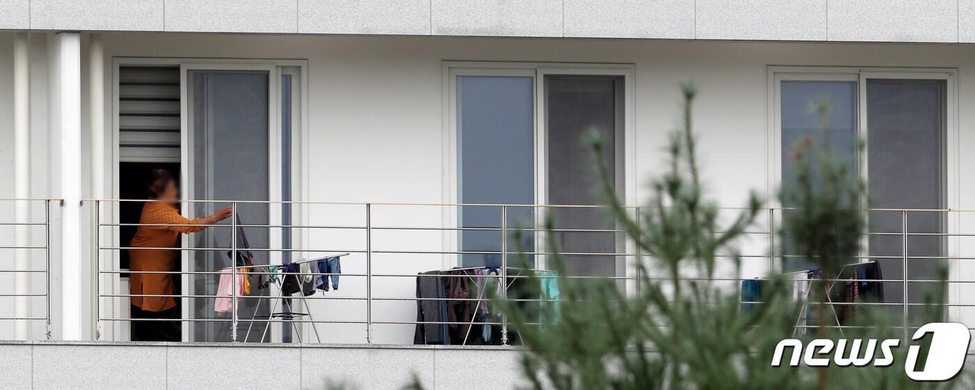 아프가니스탄인 조력자 등 가족들이 29일 오전 충북 진천군 공무원인재개발원에 마련된 임시 숙소에서 자가격리 생활 중 세탁물을 걷고 있다. 이들은 연수원에서 14일간 격리된 뒤 정착을 위한 교육을 받게되며, 약 6주 뒤에 정부가 마련한 다른 시설로 옮겨질 예정이다. 2021.8.29/뉴스1 ⓒ News1 민경석 기자