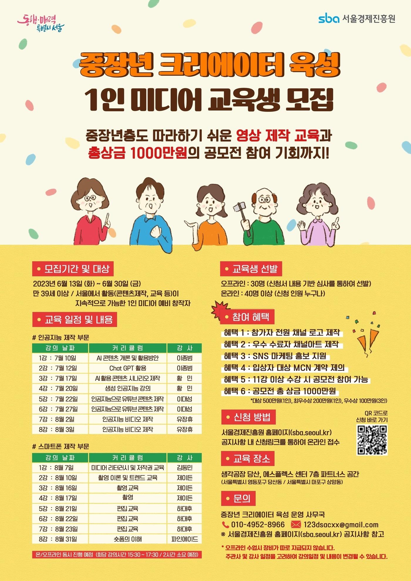 39세 이상부터 지원 가능…총 70명 선발'중장년 1인 미디어 크리에이터 육성' 포스터. (서울시 제공)관련 키워드서울시서울경제진흥원sba중장년유튜버스마트폰유튜브스마트폰영상인공지능영상인공지능관련 기사[동정]오세훈, '서울콘' 인플루언서 만나 "서울 매력 알려줘 감사"[동정] 오세훈 '2025 서울콘 크리에이티브포스 어워즈' 참석서울형 R&D, 기술개발 넘어 시민 일상·산업 현장 성과로서울시, 틱톡 동남아와 협력 확대…K-뷰티 수출길 넓힌다오세훈, 하노이서 'K-뷰티 교두보' 구축…"서울 기업 해외 진출 지원"