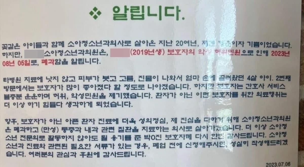 (온라인 커뮤니티 갈무리)(온라인 커뮤니티 갈무리)관련 키워드소아과소아청소년과폐과소아과폐과보호자저격악성민원허위민원고충신초롱 기자 근무 첫날부터 수백만 원 훔친 40대 여직원…"다 썼다" 오리발[영상]"변기, 바닥에 대변 범벅"…화장실 몰래 쓴 얌체족에 자영업자 경악관련 기사'영유아 치명' RSV…"치료제도 없는데, 소아과 환자 증가세"사방에서 "콜록콜록"…독감백신 맞아야 할까, 젊은 사람도? 언제?