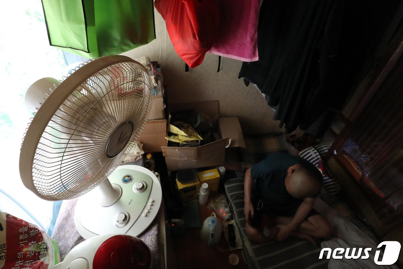 폭염 위기경보 수준이 '심각' 단계로 상햔된 2일 서울 중구 동자동 쪽방촌에서 한 어르신이 선풍기 바람에 더위를 견디고 있다. 2023.8.2/뉴스1 ⓒ News1 이동해 기자