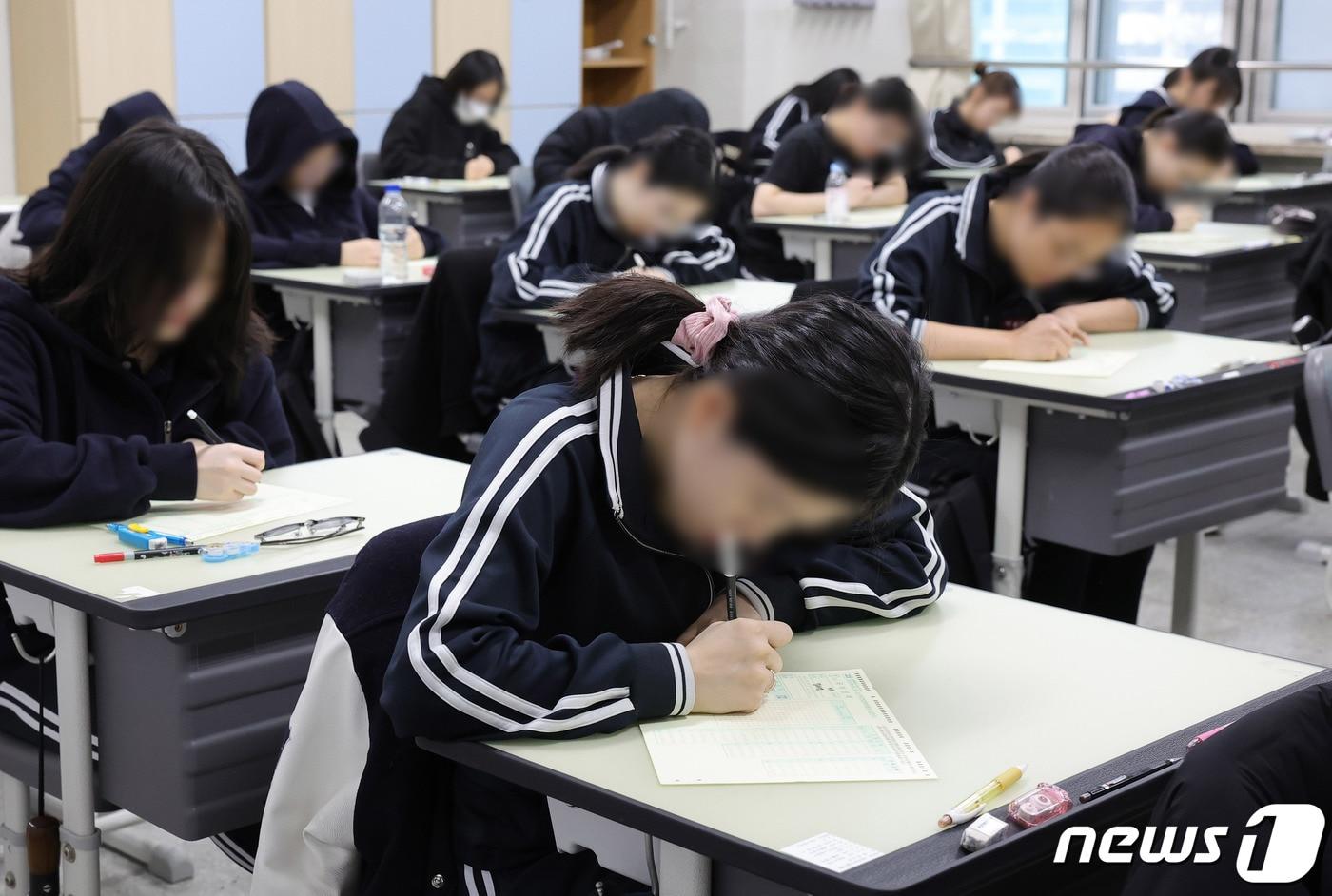 2025학년도 대학수학능력시험 대비 3월 전국연합학력평가가 시행된 28일 서울 강남구 개포고등학교에서 3학년 학생들이 답안지를 작성하고 있다./뉴스1 ⓒ News1 사진공동취재단
