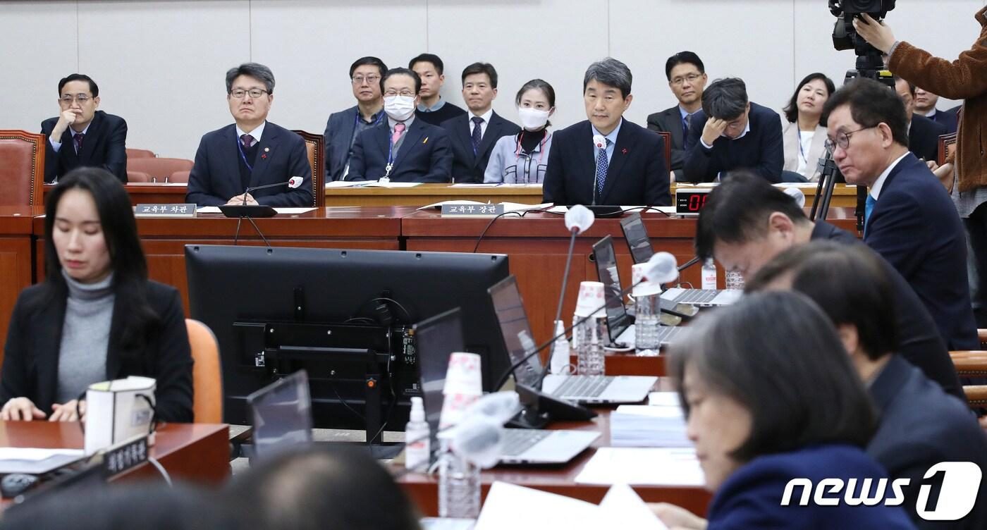 이주호 사회부총리 겸 교육부 장관과 오석환 차관이 1월 4일 오후 서울 여의도 국회에서 열린 교육위원회 전체회의에서 의원들의 발언을 경청하고 있다. /뉴스1 ⓒ News1 임세영 기자