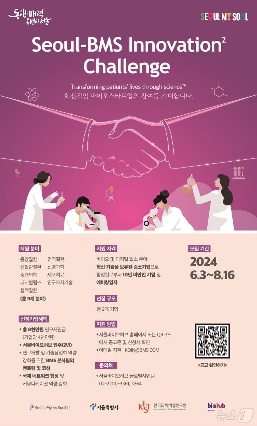 오픈 이노베이션…10년 미만 기업·예비창업자 2곳 선정4000만원과 1년간 멘토링 지원…종양질환 등 9개 분야2024 서울-BMS 이노베이션 스퀘어 챌린지. (서울시 제공)ⓒ 뉴스1관련 키워드서울시bms한국과학기술연구원오픈이노베이션이노베이션스퀘어