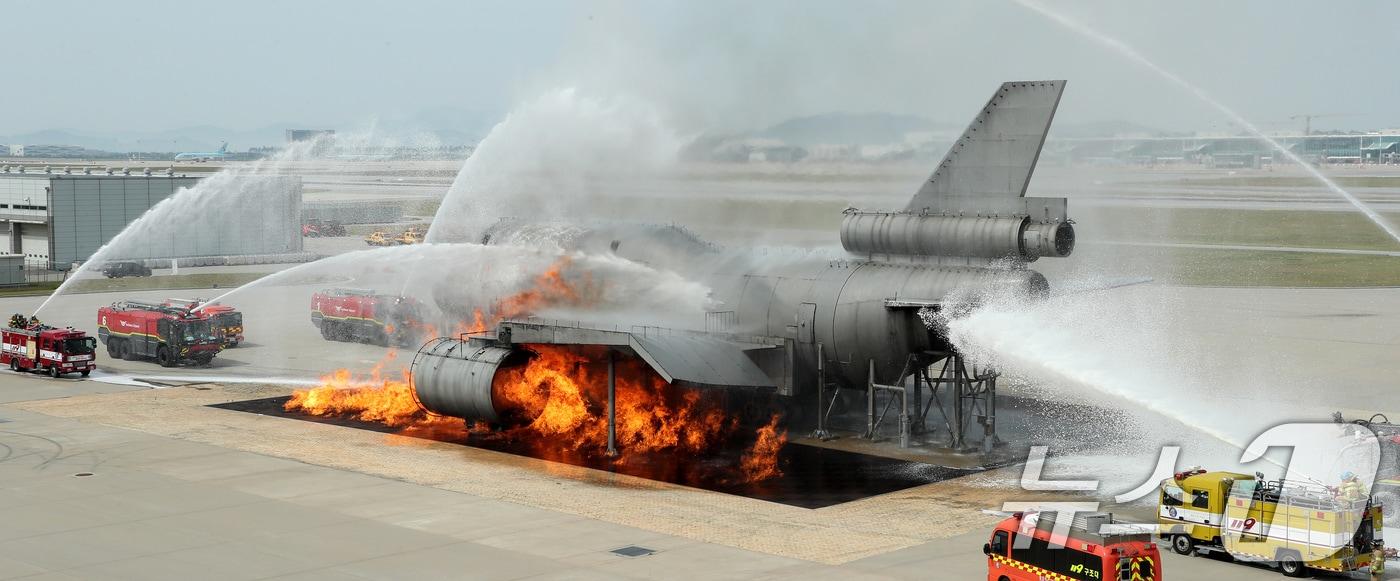 5일 오후 인천국제공항 제2활주로에서 열린 2024 READY korea 2차 훈련 중 사고가 발생한 것으로 가정한 항공기에 큰불이 발생하자 소방차가 집중 방수를 하고 있다. 이날 훈련은 항공기가 착륙을 시도하던 중 강풍으로 인해 활주로에서 이탈하며 셔틀버스에 추돌한 상황을 가정해 진행됐다. (공동취재) 2024.6.5/뉴스1 ⓒ News1 장수영 기자