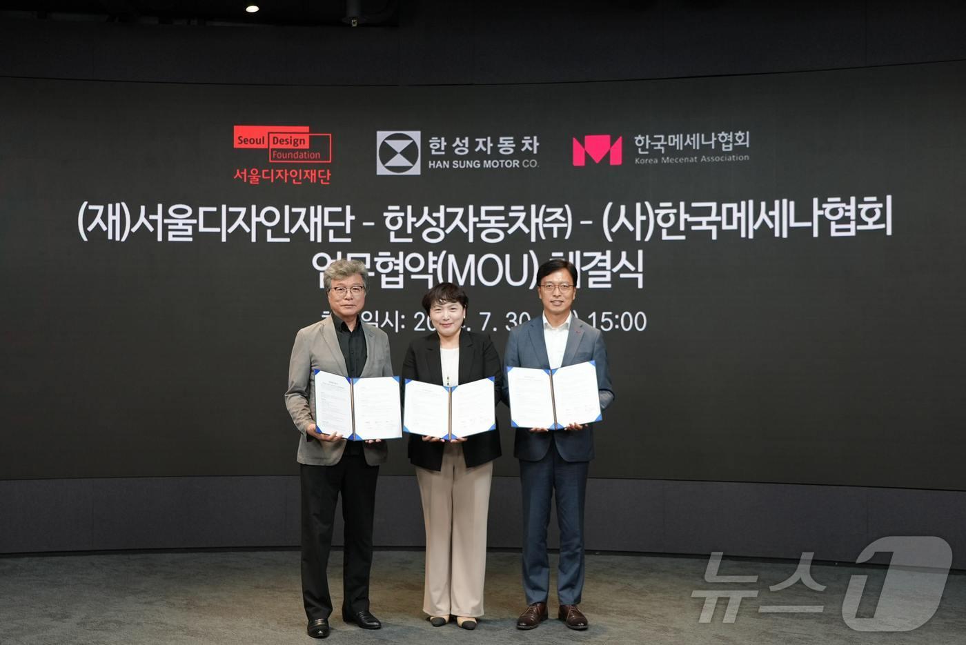 MOU 체결식. 왼쪽부터 이경돈 서울디자인재단 대표, 이재진 한성자동차 마케팅&커뮤니케이션부 이사, 이충관 한국메세나협회 사무처장. (서울시 제공)