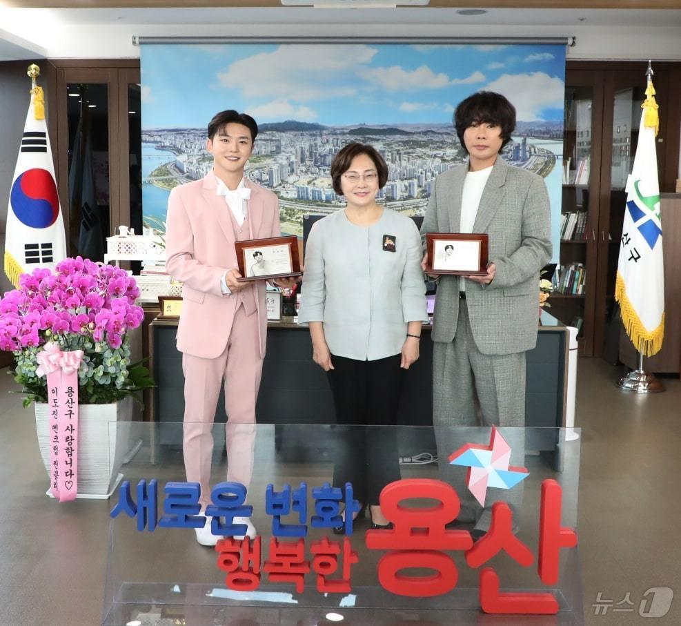 박희영 용산구청장(가운데)이 뮤지, 이도진씨에게 위촉장을 수여하는 모습. (용산구 제공)ⓒ 뉴스1