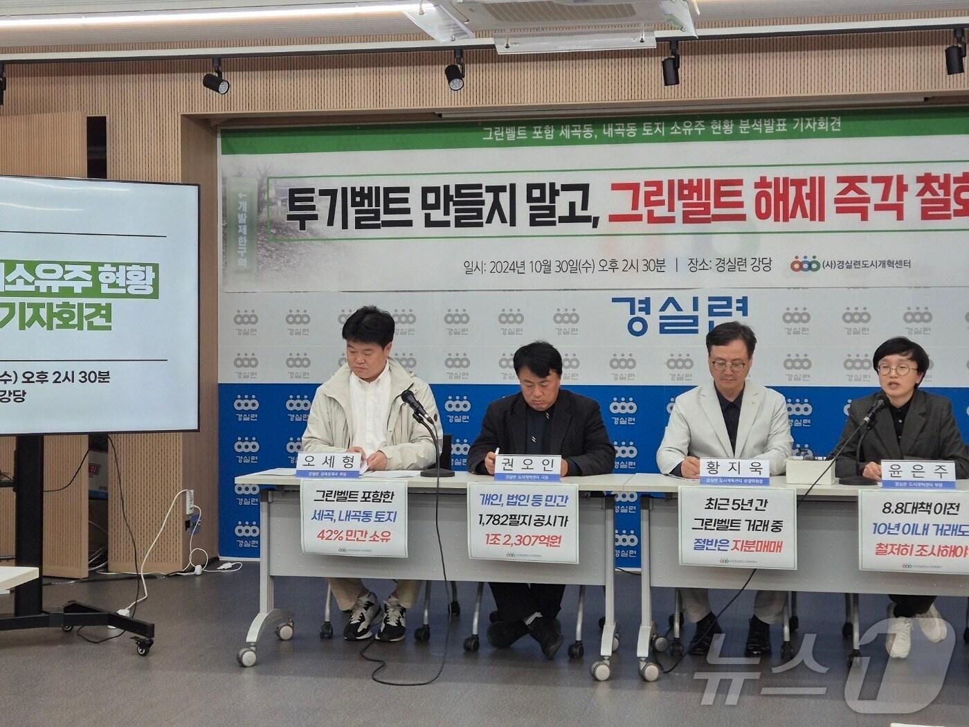 "축구장 47개 달하는 규모 그린벨트 토지 보유" 경실련 발표'지분 쪼개기' 투기 흔적도…"그린벨트 해제 철회해야" 경제정의실천시민연합(경실련)은 30일 서울 종로구 경실련 강당에서 기자회견을 열고 '강남구 세곡동·서초구 내곡동 그린벨트 토지 소유주 현황' 분석 결과를 발표했다.ⓒ 뉴스1강남구 세곡동·서초구 내곡동 그린벨트 토지 '법인(민간) 중 공시지가 차액 상위 10위' 목록.(경실련 제공)관련 키워드경실련부동산88대책그린벨트그린벨트해제강남서초남해인 기자 '수능 관련 문항 부정거래 의혹' 일타강사 현우진·조정식 등 46명 재판행상설특검, '쿠팡 취업규칙 변경' 심사한 근로감독관 첫 참고인 조사