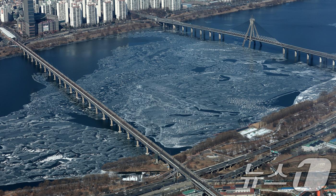 찬 대륙고기압의 영향으로 추위가 지속되고 있는 9일 서울 송파구 롯데월드타워 서울스카이에서 바라본 잠실철교와 올림픽대교 인근 한강이 얼어붙어 있다. 기상청은 이날 이번 겨울들어 처음으로 한강이 결빙되었다고 발표했다. 이번 한강 결빙은 평년(1월 10일)보다 30일, 지난 겨울(2024년 1월 26일)보다 14일 늦게 나타났으며, 1964년 2월 13일에 이어 관측 이래 두 번째로 늦은 결빙이다. 2025.2.9/뉴스1 ⓒ News1 박세연 기자