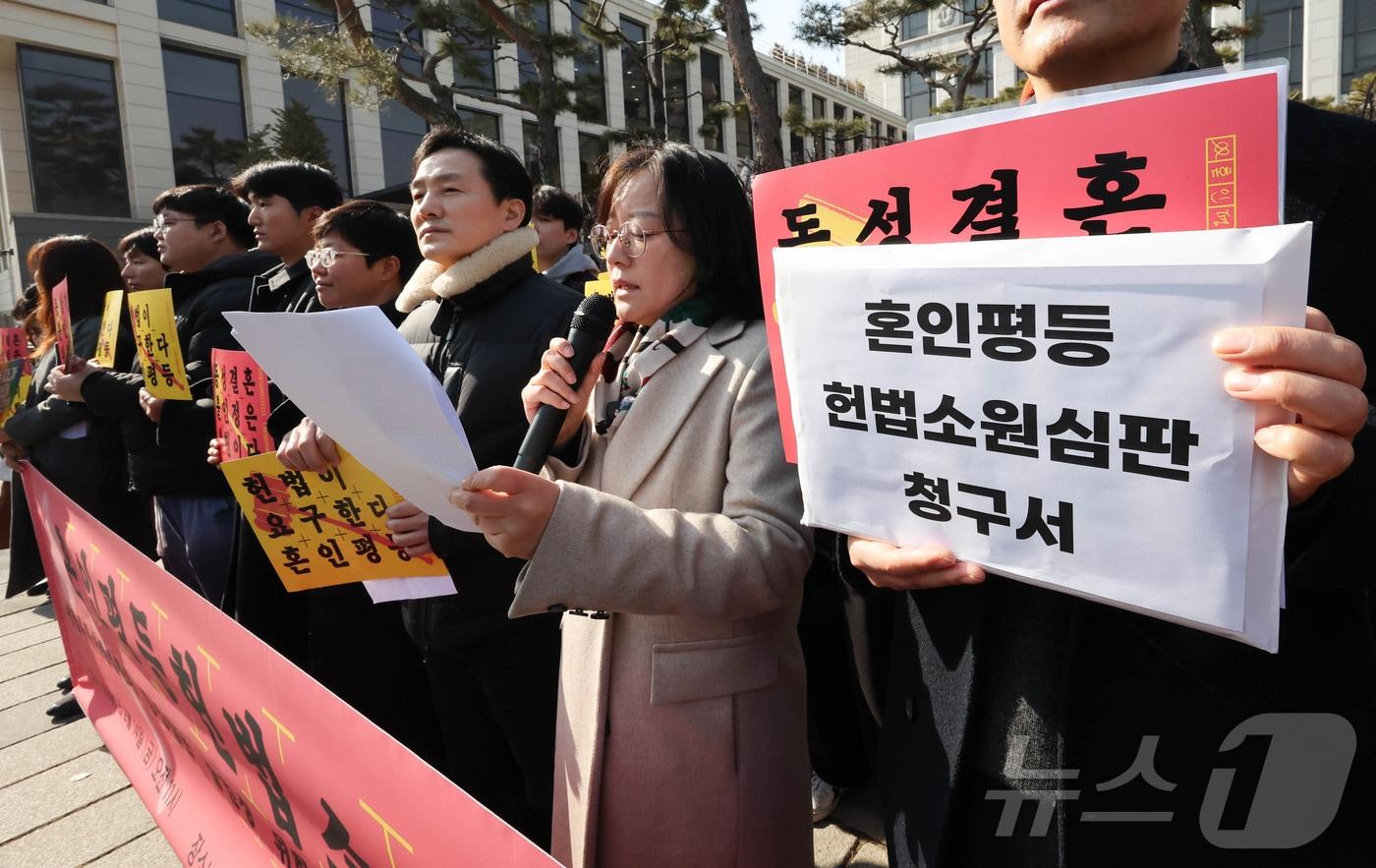 동성 부부 2쌍 헌재 청구…작년 북부지법에 혼인평등소송 제기 "동성동본금혼제·호주제도 위헌 판정…성소수자 권리 인정해야"민변 공익인권변론센터 관계자들이 14일 서울 종로구 헌법재판소 앞에서 북부지법의 동성결혼 불인정 위헌법률심판제청신청 기각에 따른 헌법소원심판 제기 혼인평등헌법소원 기자회견을 하고 있다. 2025.2.14/뉴스1 ⓒ News1 허경 기자관련 키워드헌법재판소혼인평등동성결혼헌법소원박혜연 기자 "백 사는데 집 주소·SNS까지"…에르메스 '고객 뒷조사' 논란마뗑킴부터 무신사·LF까지…패션업계 협업 경쟁 열기
