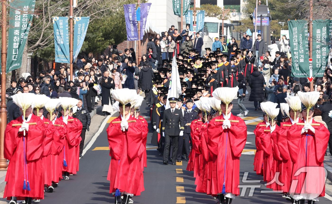 25일 서울 종로구 성균관대학교에서 열린 2025년 겨울 학위수여식에서 총장, 교무위원, 졸업생들이 고유례를 마치고 행진하고 있다. 고유례는 학교의 입학·졸업·건물신축 등 큰 행사가 있을 때 공자의 사당을 찾아 이를 고하는 고유의식이다. 2025.2.25/뉴스1 ⓒ News1 김명섭 기자