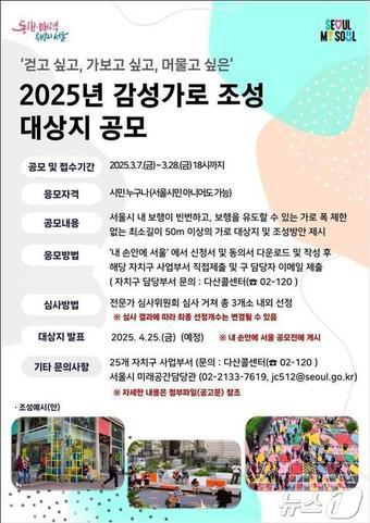 7일부터 28일까지 관심 있는 누구나 참여 가능감성가로 조성 공모 포스터. 관련 키워드감성가로서울시공모전이설 기자 [동정] 오세훈, 고위공직자 대상 청렴 교육 수강전국 집중호우로 대피 3555명 '미귀가'…도로·철도 곳곳 통제