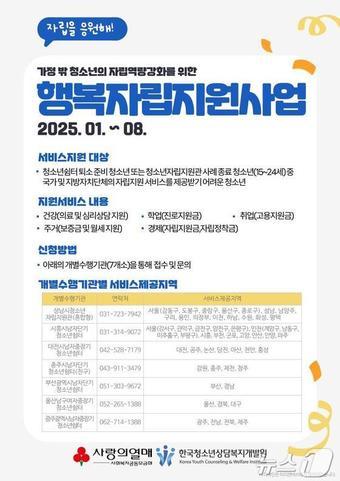 청소년쉼터 퇴소 준비 등 청소년 대상 행복자립지원사업 포스터.관련 키워드자립준비청년청소년상담복지개발원이설 기자 [동정] 오세훈, 고위공직자 대상 청렴 교육 수강전국 집중호우로 대피 3555명 '미귀가'…도로·철도 곳곳 통제