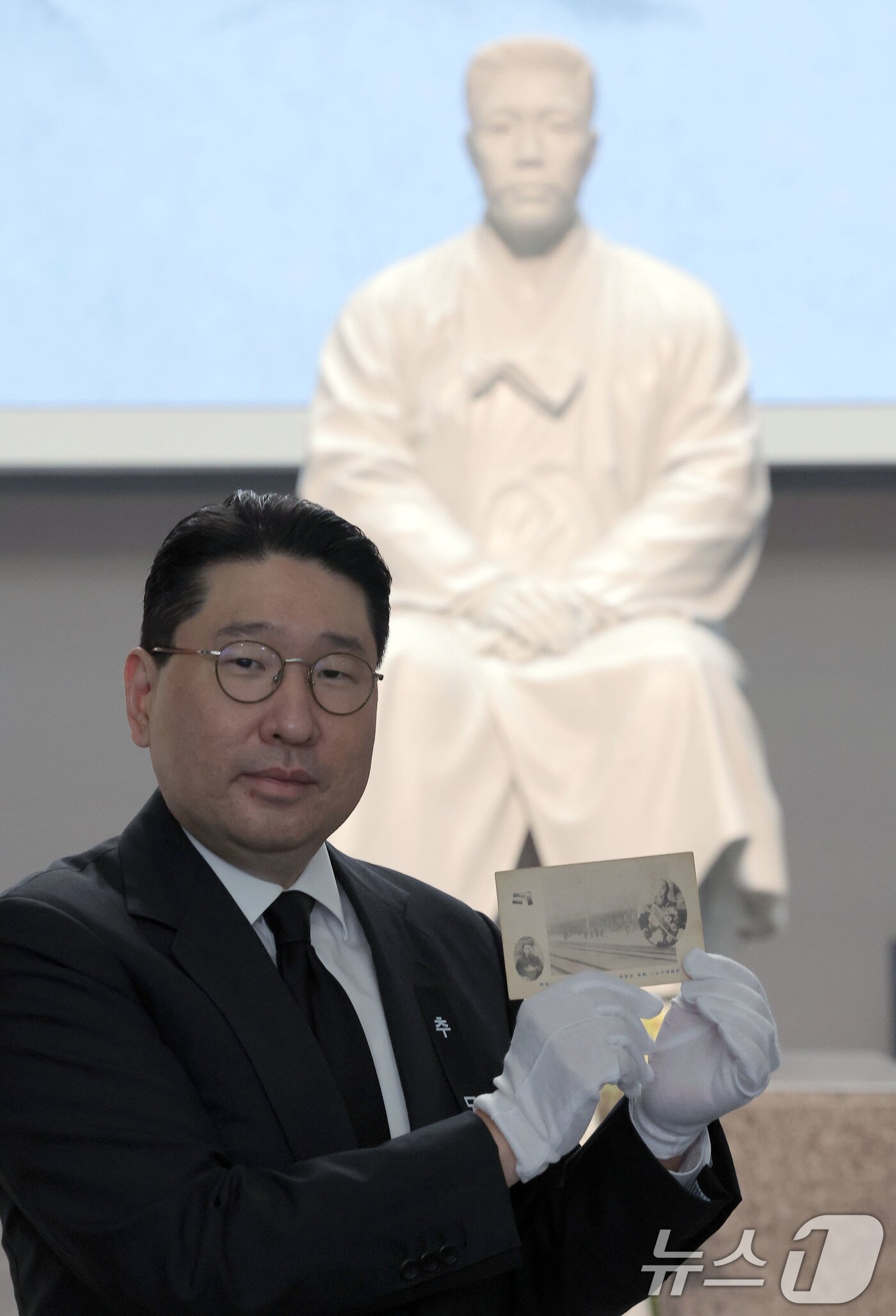 이상현 안중근의사숭모회 이사(태인 대표)가 26일 오전 서울 중구 남산 안중근의사기념관에서 안중근 의사 순국 115주기 기념일을 맞아 안중근 의사와 이토히로부미가 한 화면에 담긴 엽서를 공개하고 있다. 2025.3.26/뉴스1 ⓒ News1 박정호 기자