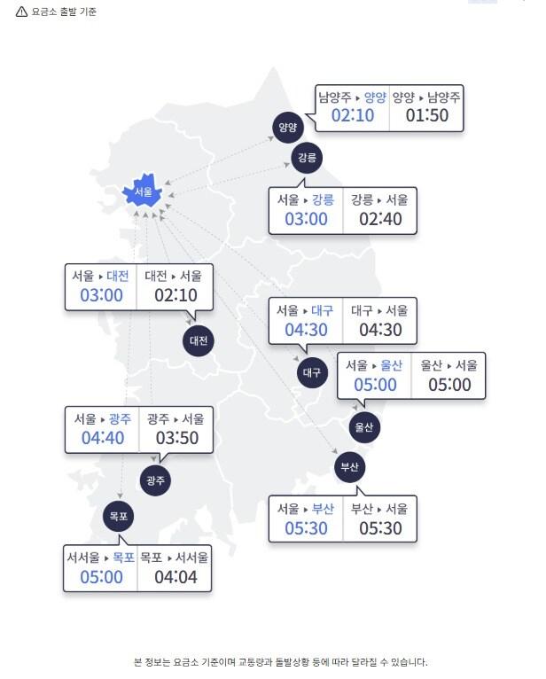 지방 방향 오후 11시 경부선·서해안선 가장 혼잡서울 방향 정체 오후 5~6시 최대…9시부터 해소주요 도시 예상 소요 시간(한국도로공사 제공)관련 키워드고속도로교통상황한국도로공사남해인 기자 공소청법 '검사 정치 관여죄' 신설에 檢 당혹…"정치 메시지"특검, '내란 우두머리' 尹에 사형 구형…'법정 최고형' 상징성 고려한 듯관련 기사도로공사 제설 관리 부실 질타…김윤덕 "사람 목숨 한 명이 중요"대통령 경고 무색…블랙아이스 사고 반복, 국토부 전수조사 착수경광등 켜도 못 막았다…고속도로 '2차 사고' 예방 시스템 한계사망 5명 서산영덕선 참사…국토부, 한국도로공사 제설 감사 착수'최대 11㎝ 적설' 전남 진도·해남 버스 운행중단