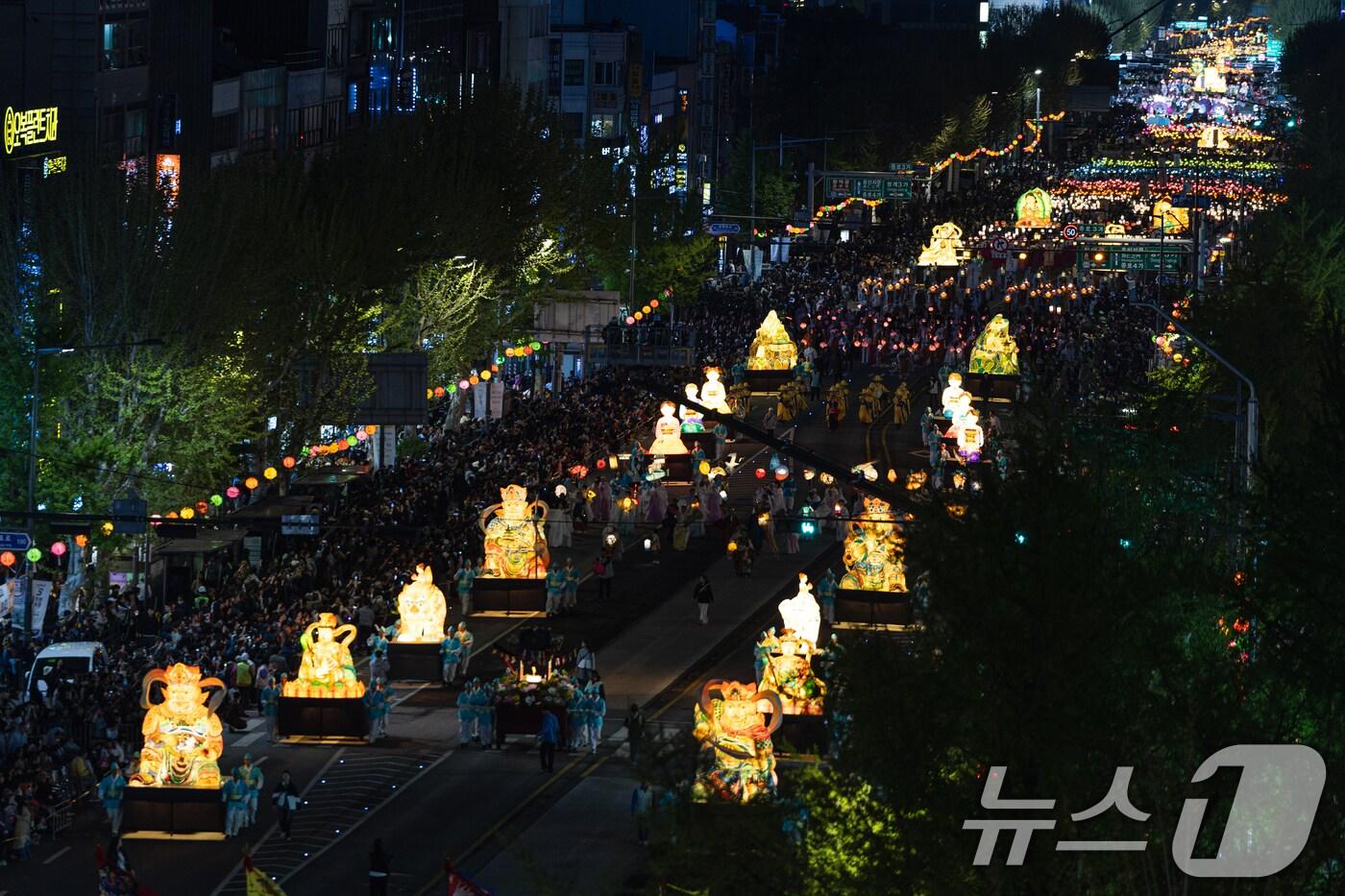 불기 2569년 부처님오신날을 앞두고 11일 저녁 서울 종로구 보신각 사거리 앞을 '연등회' 행렬이 지나고 있다. 연등회는 통일신라 시대부터 약 1200년 간 이어져 내려온 전통 문화행사로, 지난 2020년에는 유네스코 세계무형문화유산으로 등재됐다. 2024.5.11/뉴스1 ⓒ News1 민경석 기자