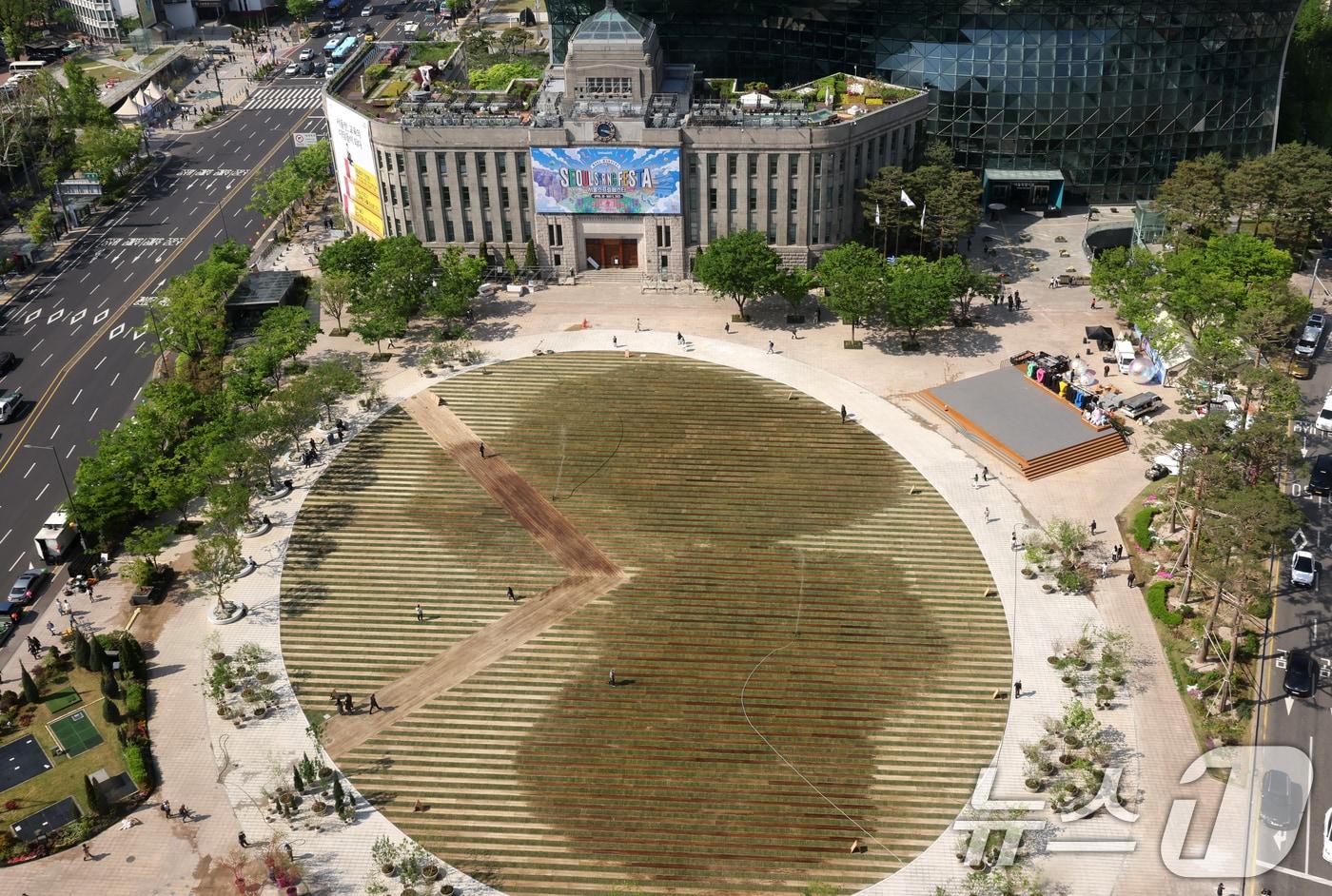 28일 시민들에게 공개된 서울 중구 서울광장의 모습. 서울광장 바닥에 우리 기후 특성에 맞는 난지형 잔디(한국형잔디)로 교체하고 잔디 사이에는 나무길이 조성됐다. 서울시는 올 하반기에 서울광장 2차 개선 프로젝트에 들입, 내년 4월까지 서울광장 숲을 완성할 계획이다. 2025.4.28/뉴스1 ⓒ News1 장수영 기자
