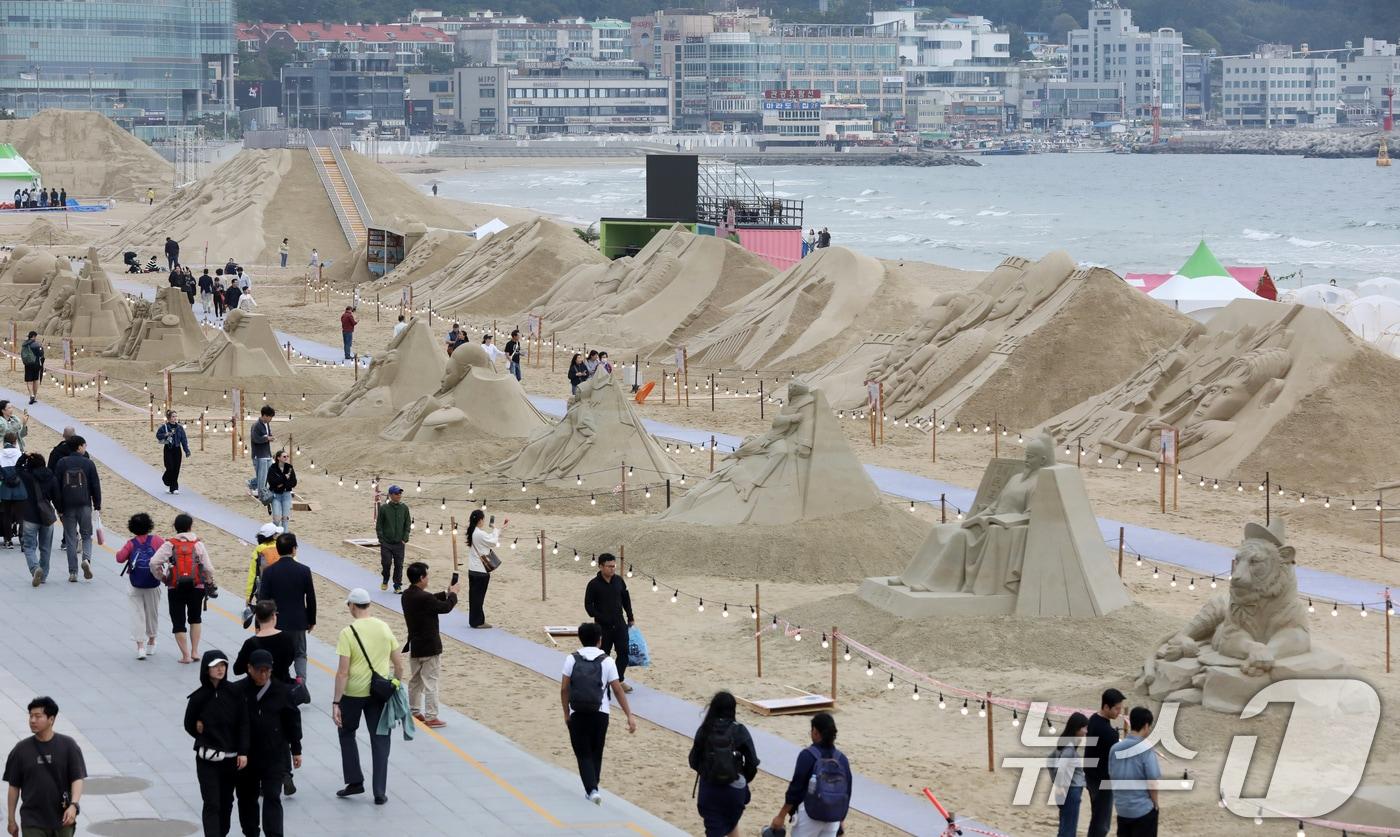 15일 오후 부산 해운대해수욕장을 찾은 시민, 관광객들이 다양한 모래조각 작품을 구경하고 있다. 해운대해수욕장에는 오는 16일부터 19일까지 '모래로 만나는 K-컬처' 를 주제로 '2025 해운대 모래축제'가 개최된다. 올해로 20주년을 맞은 해운대 모래축제에는 미국·캐나다·중국·러시아 등 14명의 해외 모래 작가가 총 20여 개의 작품을 선보인다. 2025.5.15/뉴스1 ⓒ News1 윤일지 기자