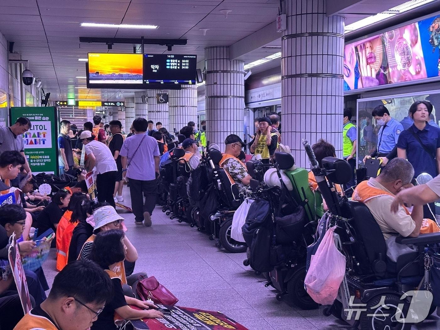 서울 1호선 시청역 승강장서 '지하철행동' 이어가'시설보호' 아닌 중증장애인 '활동지원' 확대 촉구전국장애인차별철폐연대와 서울장애인차별철폐연대 활동가들이 8일 서울 1호선 시청역 승강장에서 '지하철행동'을 하고 있다. 2025.7.8/뉴스1 ⓒ News1 강서연 기자관련 키워드전장연서장연장애인차별철폐연대오세훈강서연 기자 "새해 첫날에도 일해요"…1월 1일에도 멈추지 않는 사람들法, '선행매매 22억 편취' 핀플루언서 보석…건강상 이유