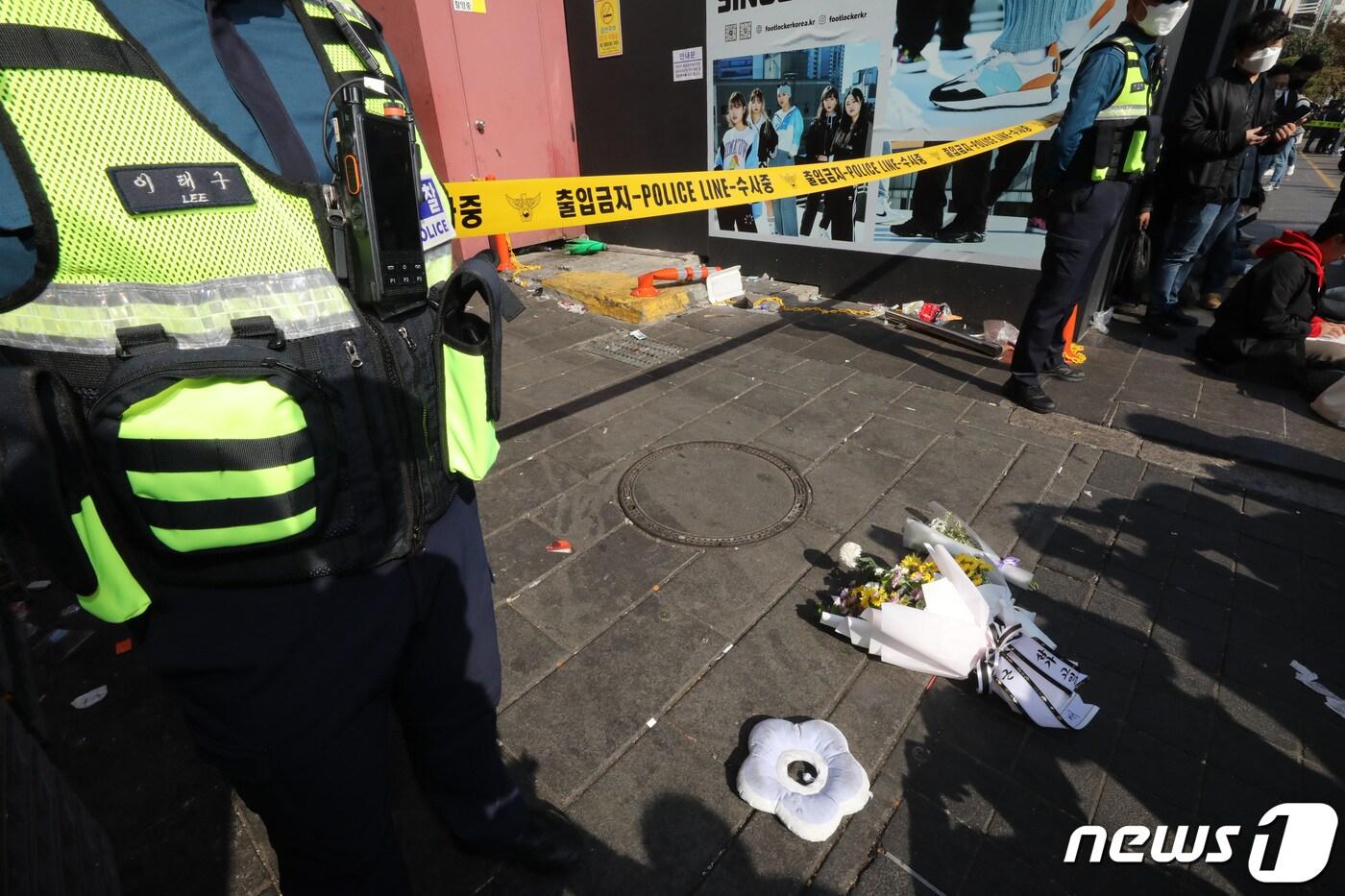30일 오후 서울 용산구 이태원 압사 사고 현장 인근에 한 시민이 두고 간 꽃이 놓여져 있다. 이태원 압사사고로 발생한 인명피해는 이날 현재 사망 151명, 중상 19명, 경상 63명이다. 2022.10.30/뉴스1 ⓒ News1 임세영 기자