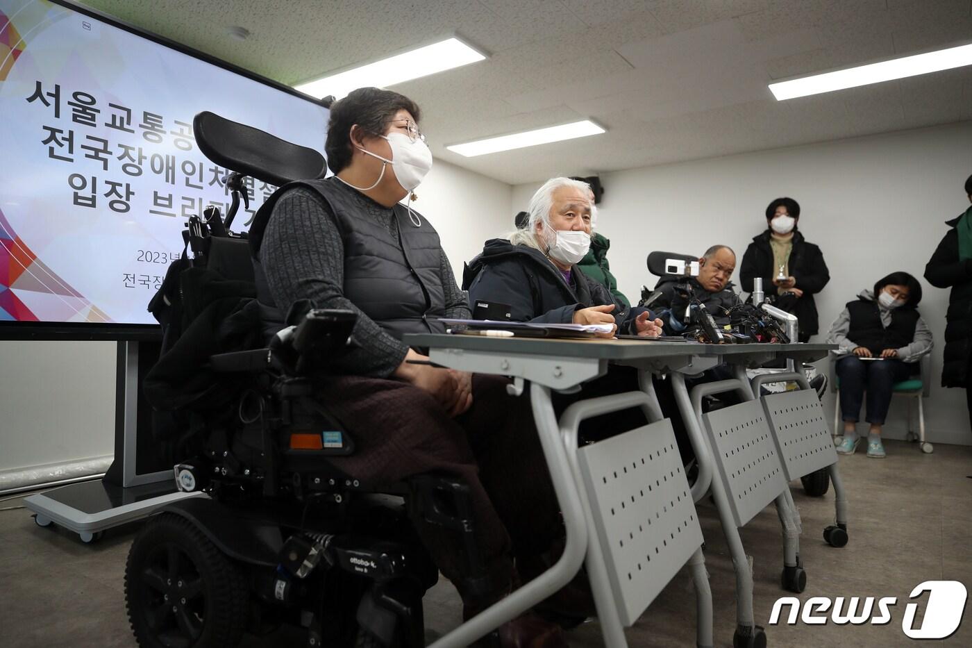 박경석 전국장애인차별철폐연대 상임대표와 김석호 서울교통공사 영업본부 본부장이 4일 오후 서울 종로구 전국장애인차별철폐연대 사무실에서 면담을 하고 있다. 2023.1.4/뉴스1 ⓒ News1 이승배 기자전국장애인차별철폐연대(전장연) 활동가들이 3일 오전 서울 동대문역사공원역에서 지하철 승차를 막는 경찰들과 대치하고 있다. 전장연은 이날 오전 8시 성신여대역에서 기습 선전전을 진행했다. 2023.1.3/뉴스1 ⓒ News1 김도우 기자전국장애인차별철폐연대(전장연) 회원들이 2일 오전 서울 삼각지역에서 장애인 권리 예산 확보를 위한 지하철 타기 선전전에 앞서 법원의 조정안을 수용한 5분 타이머를 맞추고 있다. 2023.1.2/뉴스1 ⓒ News1 이동해 기자윤다정 기자 "美빅테크, AI 데이터센터 부채 재무제표서 숨겨…SPV 꼼수""예수는 팔레스타인인이다"…뉴욕 타임스 스퀘어 광고에 '시끌'