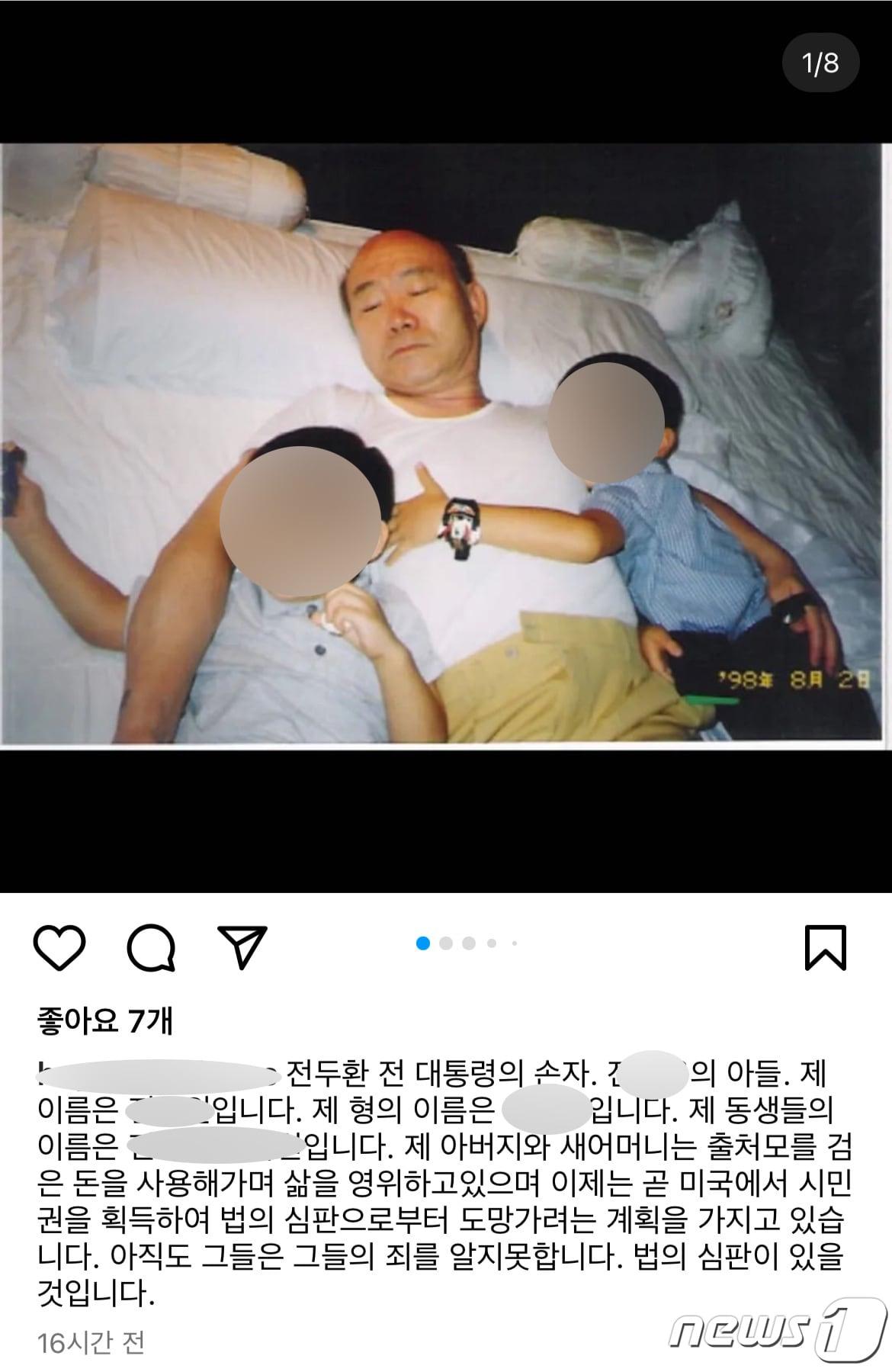 "속인주의에 수사 불가피…경찰 조사 뒤 처벌수위 결정"마약 혐의에 귀국 직후 5·18 유가족·피해자 사죄 불분명전우원씨가 게시한 사진과 글. 전두환씨로 추정되는 인물의 양 옆에 아이들이 누워있다. (SNS 캡처) 2023.3.15/뉴스1 ⓒ News1 이수민 기자관련 키워드전우원마약혐의전두환손자내일입국속인주의경찰지인수사LSD김동규 기자 대우건설, 영업정지 2개월 위기 넘겨…법원 집행정지 인용인천·수원발 KTX 직결 운행 확대…철도공단 '전국 연결' 가속화관련 기사"차라리 태어나지 말 걸"…전두환 품에 안긴 손자 전우원, 어린 시절 회상'전두환 손자' 전우원, AI로 웹툰 연재…아빠 불륜·새엄마 갈등 전부 폭로6년째 5·18 참배 盧 아들…"할아버지는 학살자" 외친 全 손자는?