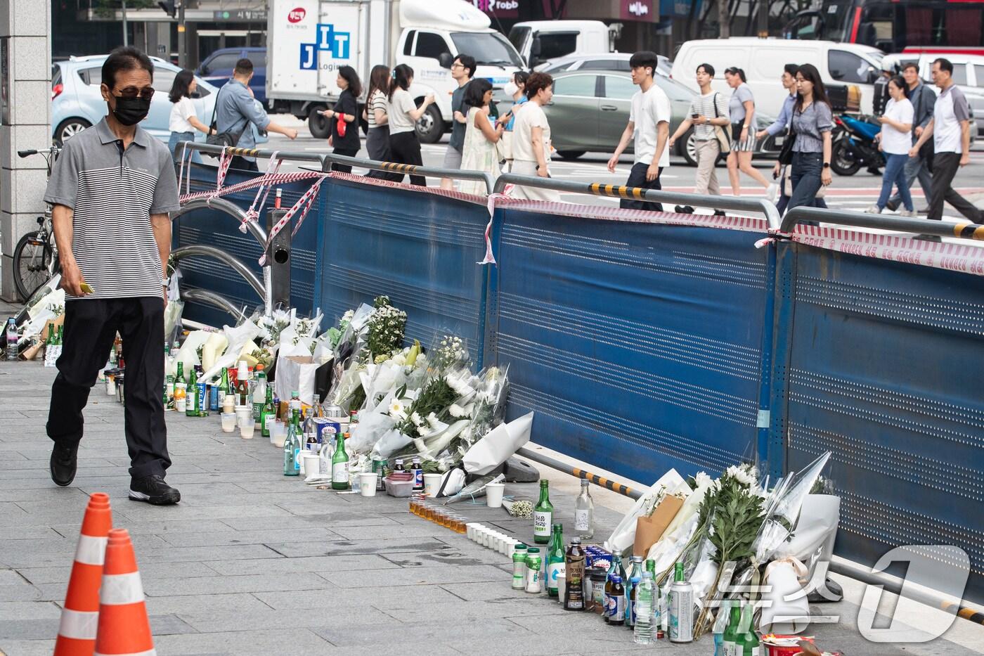 4일 서울 중구 시청역 인근 역주행 교통사고 현장에 희생자를 추모하는 국화와 술 등이 놓여 있다. 2024.7.4/뉴스1 ⓒ News1 유승관 기자