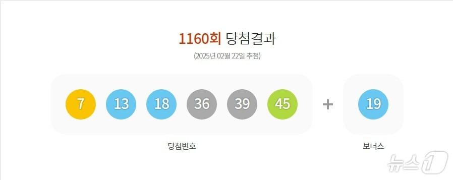 1등 당첨번호 '7·13·18·36·39·45'…보너스 번호 '19'1160회 로또 1등 당첨 번호. 2025.02.22/뉴스1(동행복권 홈페이지 갈무리)관련 키워드로또김민수 기자 KT "독파모 재도전 여부 검토한 바 없어"[속보] KT "국대 AI 재도전 여부 검토한 바 없어"관련 기사[오늘의 운세] 2026년 1월 17일 띠별 운세강남로또 당첨 때까지 '장남 위장미혼'…이혜훈 상습 부정청약[오늘의 운세] 2026년 1월 16일 띠별 운세국힘 "이혜훈, 핵심 자료 제출 거부…민주당, 인사청문회 미뤄달라"[오늘의 운세] 2026년 1월 15일 띠별 운세