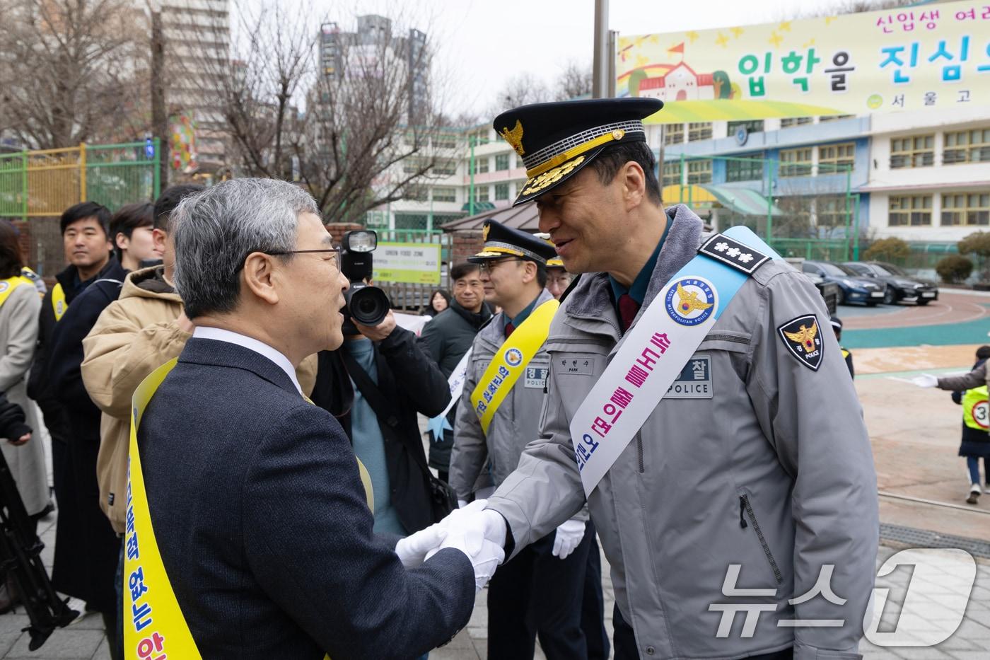 5일 오전 서대문구 고은초 방문…정근식 서울시교육감과 간담회"도박·마약·딥페이크 집중 예방"…헌재 인근 학교 안전관리 당부박현수 서울지방경찰청장 직무대리가 5일 오전 서울 서대문구 고은초등학교앞에서 열린 신학기 안전한 학교 만들기 캠페인에서 정근식 서울시교육감과 인사를 나누고 있다. 2025.3.5/뉴스1 ⓒ News1 이승배 기자관련 키워드박현수서울경찰청장고은초정근식유수연 기자 尹 '체포방해' 1심 징역 5년…특검 "일부 무죄 면밀 검토할 것"(종합2보)尹 '체포방해' 1심 징역 5년…法 "헌법 위배, 반성도 안 해"(종합)관련 기사전북·제주 10명 중 4명이 '언어폭력'…학폭 응답 3.1% '전국 최고'(종합)[뉴스1 PICK]스쿨존 안전수칙 지켜주세요