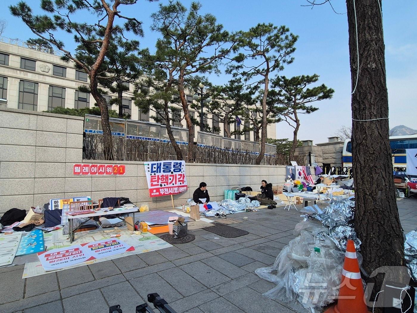 경찰 '진공 상태' 유지 방침에도 尹 지지자 10여명 헌재 앞 농성 이어가안국역 일대 탄핵 찬반 집회 지속…시민들 "선고에 너무 오래 걸렸다"2일 오전 서울 종로구 재동 헌법재판소 정문 우측에는 약 15명의 윤 대통령 지지자들이 돋자리를 깔고 윤 대통령 탄핵 반대 농성을 이어가고 있다. 2025.4.2/뉴스1 ⓒ News1 조유리 기자2일 서울 종로구 열린송현녹지광장 앞에서 열린 '내란수괴 윤석열 파면버스 출정식'에서 참가자들이 구호를 외치고 있다. 2025.4.2/뉴스1 ⓒ News1 김도우 기자윤석열 대통령 탄핵 심판 선고일을 이틀 앞둔 2일 서울 종로구 헌법재판소 인근을 경찰들이 통제하고 있다. 2025.4.2/뉴스1 ⓒ News1 김도우 기자관련 키워드윤석열탄핵심판尹비상계엄선포헌재헌법재판소이기범 기자 KT 위약금면제 마지막날, 이탈 30만 넘나…"스마트폰 씨 말라"국가대표 AI 5개 모델 평가에 '개별 벤치마크' 점수 도입조유리 기자 전국 소아심장외과 의사 단 '27명'…어린이 과반 '원정 수술'백신 회의론 영향 받았나…미국 '홍역' 환자 수 33년만에 최대관련 기사헌재 앞 도로 열렸다…경찰 "주민 불편 극심해 조치, 경력은 유지"[尹탄핵인용] 헌재 앞 눈물·환호…관저 앞 대성통곡(종합)"파면이 정의다" 헌재 앞 눈물·환호…尹지지자 욕설·폭력[尹탄핵인용]尹 선고 D-1 헌재 앞 '폭풍 전야'…시민들 "간만에 조용하네"尹 선고 D-1 헌재 앞 점검…서울청장 대리 "질서유지 시민 협조 부탁"