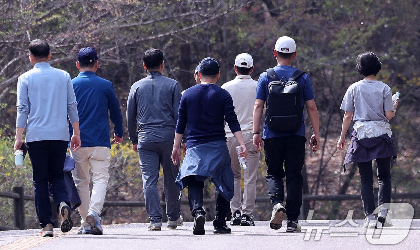 꽃샘추위가 끝나고 포근한 봄 날씨가 이어진 16일 서울 남산에서 시민들이 겉옷을 허리에 두른채 산책하고 있다. 다만 낮과 밤의 일교차가 최대 20도까지 크게 벌어져 건강 관리에 주의가 필요하다. 2025.4.16/뉴스1 ⓒ News1 박지혜 기자