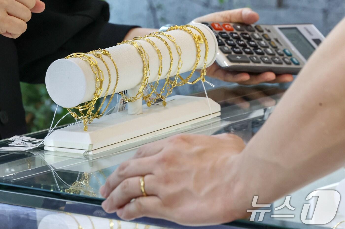 24일 서울 종로구 한국금거래소 종로본점에서 직원이 금팔찌 가격을 묻는 손님에게 가격을 설명하고 있다. 2025.4.24/뉴스1 ⓒ News1 민경석 기자