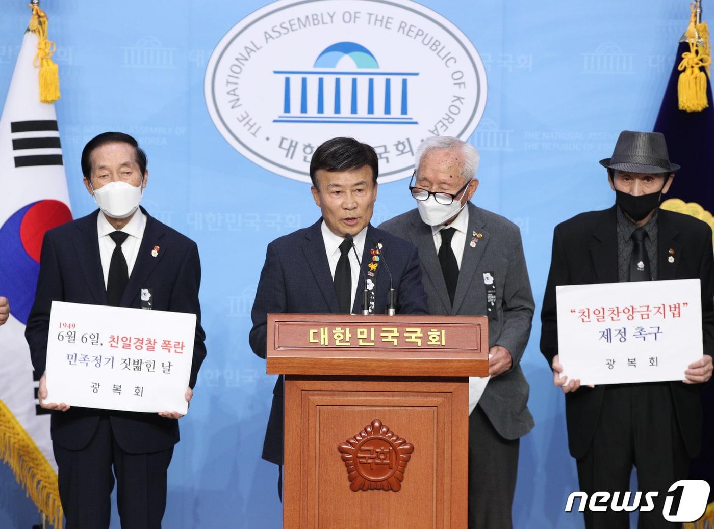 김원웅 광복회장이 4일 오전 서울 여의도 국회 소통관에서 6.6 반민특위 습격사건 관련 기자회견을 하고 있다. 1949년 6월 6일은 친일경찰이 반민특위를 습격한 날로 광복회는 올해부터 이날을 '민족정기가 짓밟힌 날'로 정하며 경찰청장의 공개 사과를 촉구했다. 2020.6.4/뉴스1 ⓒ News1 신웅수 기자