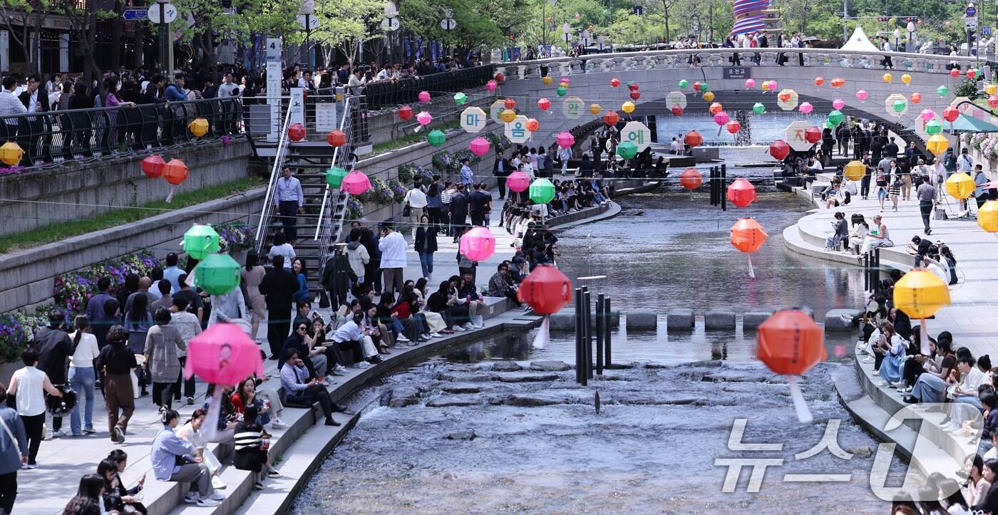 30일 오후 서울 청계천을 찾은 시민들이 가벼운 옷차림으로 즐거운 점심시간을 보내고 있다. 2025.4.30/뉴스1 ⓒ News1 박지혜 기자