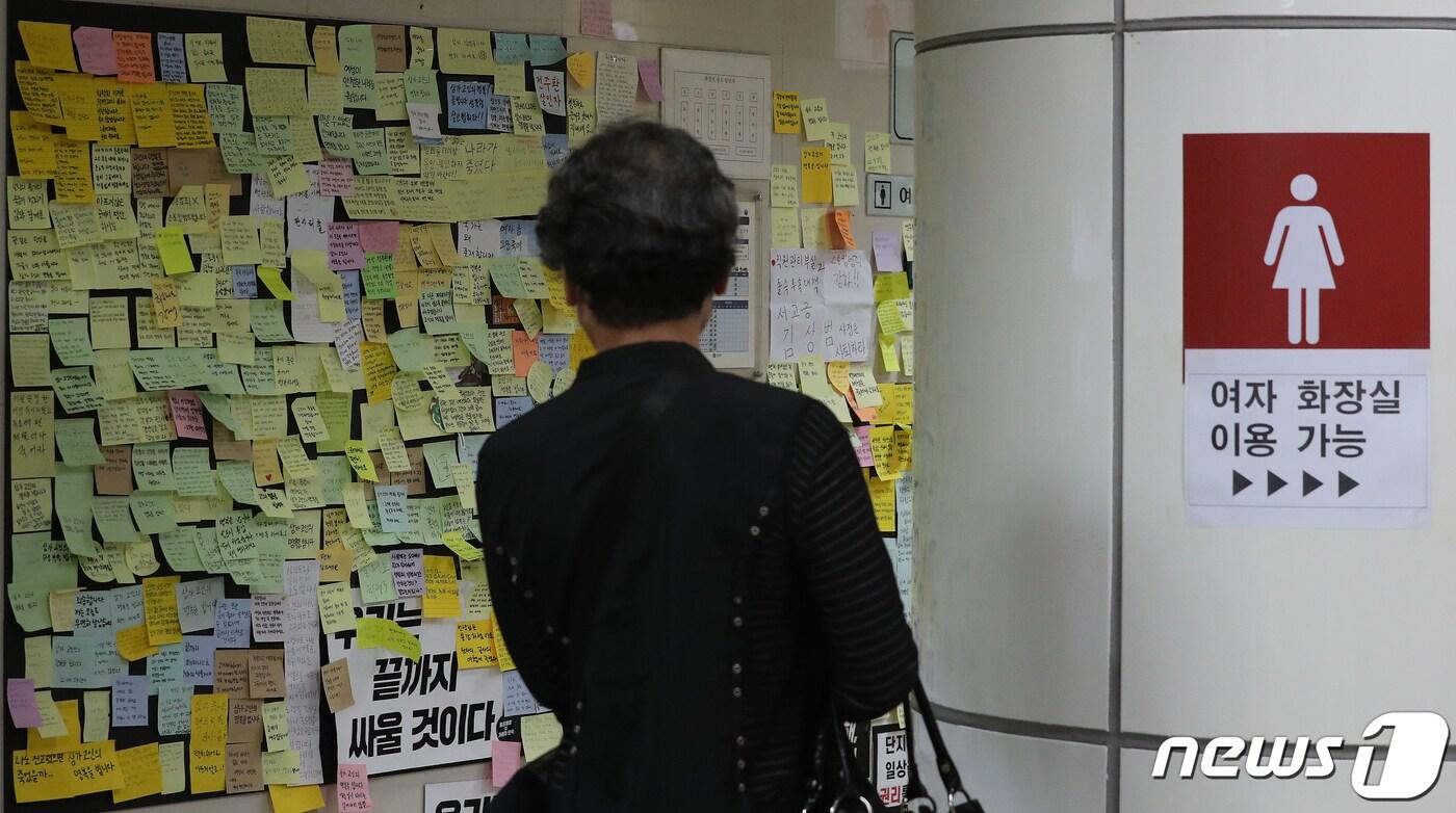 29일 서울 중구 신당역 내 여자화장실 앞에 마련된 '신당역 스토킹 사건' 피해자 추모공간을 찾은 시민들이 애도를 표하고 있다. 2022.9.29/뉴스1 ⓒ News1 김진환 기자