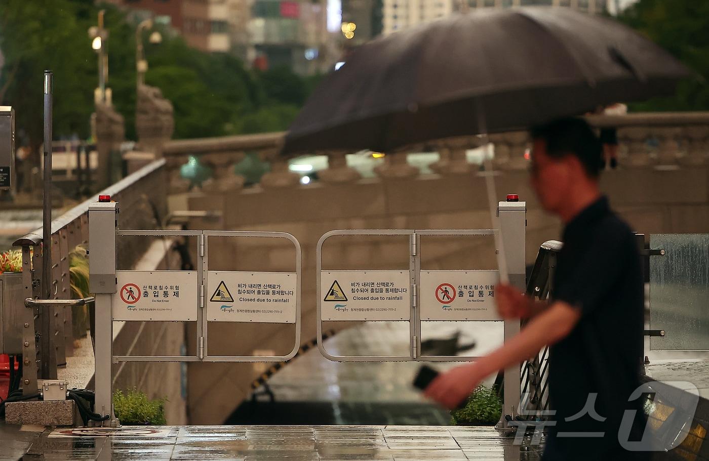 기습 폭우가 내린 8일 오후 서울 중구 청계천이 통제돼 있다. 2025.7.8/뉴스1 ⓒ News1 김진환 기자