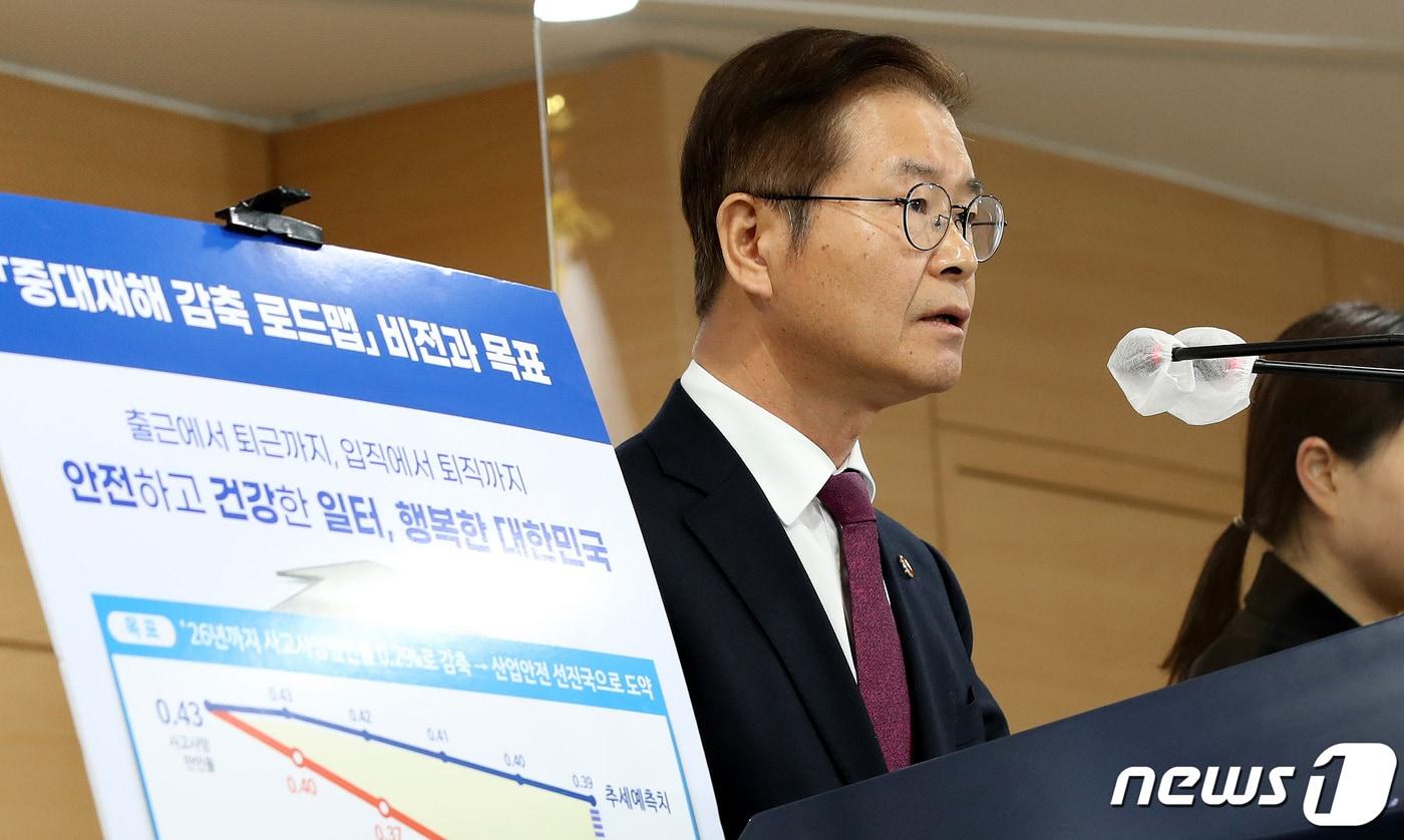이정식 고용노동부 장관이 30일 서울 종로구 정부서울청사에서 중대재해 로드맵을 발표하고 있다. 이날 정부는 산재 사망사고를 줄이기 위해 지금껏 형식적으로 운용되고 있던 기업의 ‘위험성평가’를 의무화하기로 했다. 이를 통해 8년째 정체 중인 산재 사고사망 만인율을 오는 2026년까지 0.29로 감축하겠다는 계획이다. 2022.11.30/뉴스1 ⓒ News1 박지혜 기자
