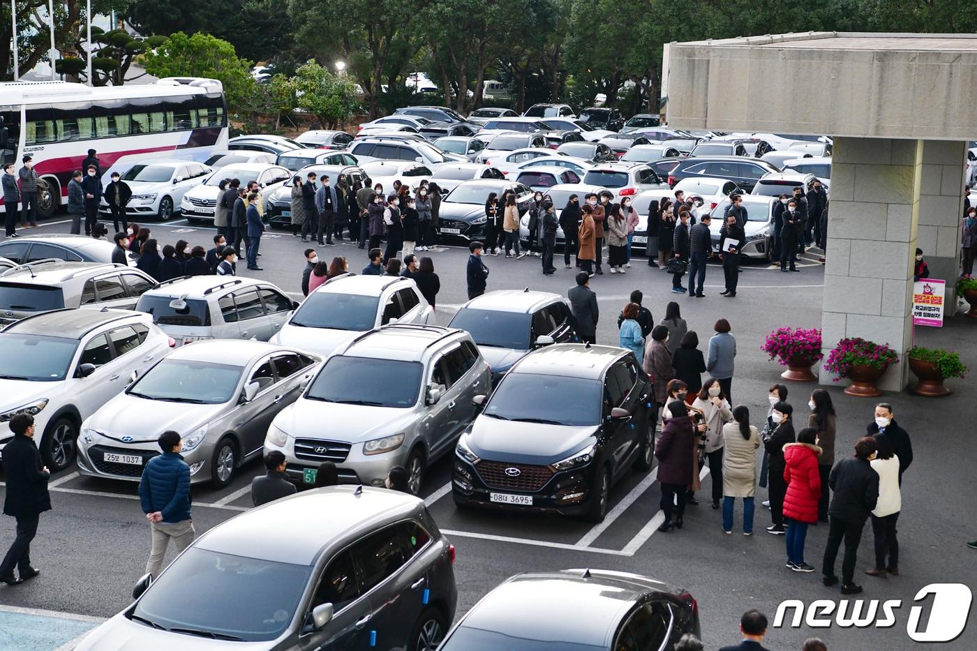 14일 오후 5시19분 제주 서귀포시 서남서쪽 41㎞ 해역에서 규모 4.9의 지진이 발생해 제주도교육청 직원들이 건물 밖으로 대피한 모습.(제주도교육청 제공)2021.12.14/뉴스1 ⓒ News1 홍수영