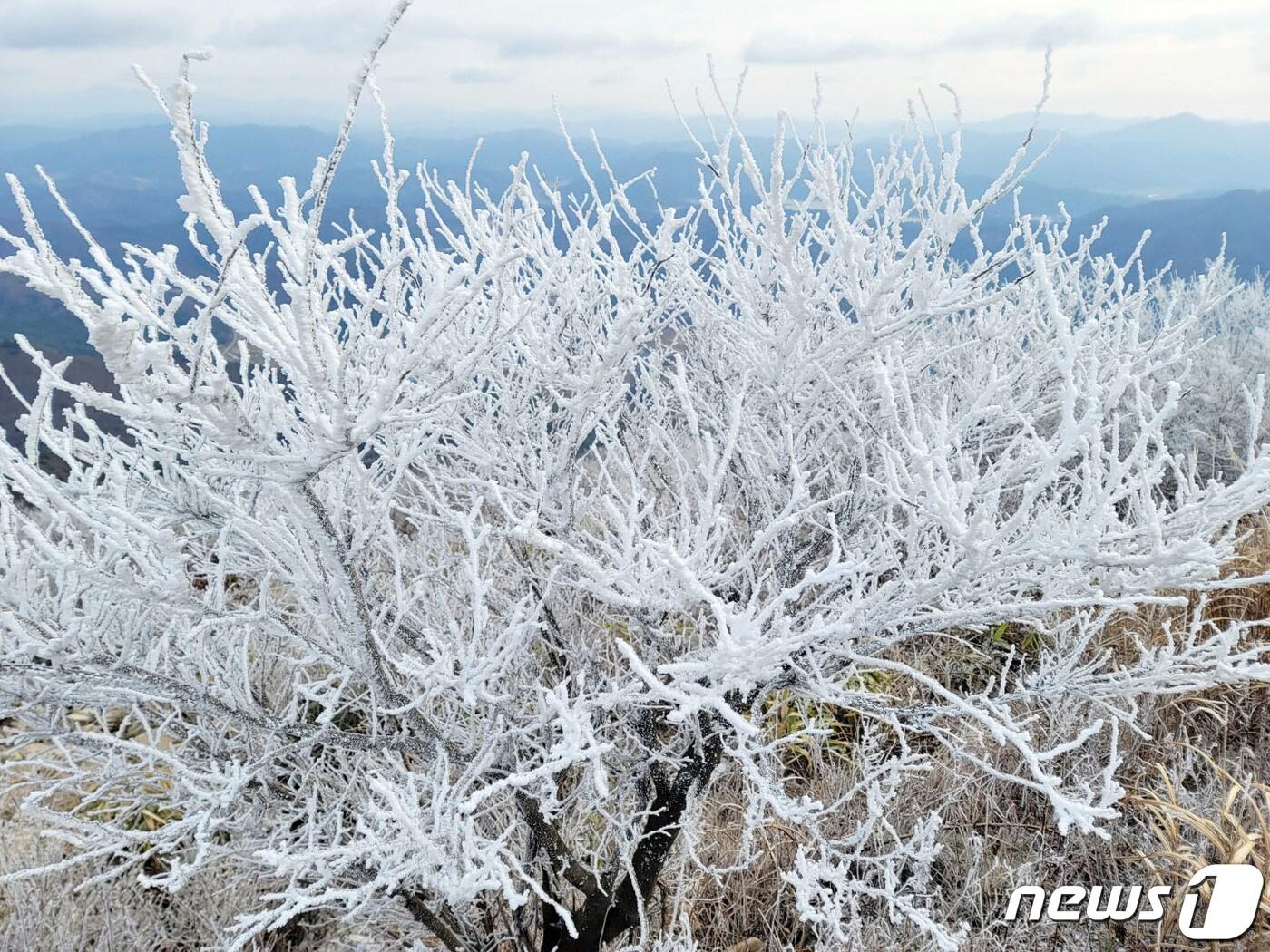 전날보다 기온 2~6도 떨어져 추위 기승대기 건조하고 강한 바람…'화재주의'무등산 국립공원 정상에 겨울이 성큼 찾아왔다. 광주전남 지역에 한파경보가 발효된 30일 무등산에는 올 겨울 처음으로 상고대가 피었다. 이날 오전 무등산 최저기온은 -7.7도를 기록했다. 상고대는 나무나 풀에 내려 눈처럼 얼어붙은 서리를 말한다. (무등산국립공원사무소 제공) 2022.11.30/뉴스1 ⓒ News1 박준배 기자