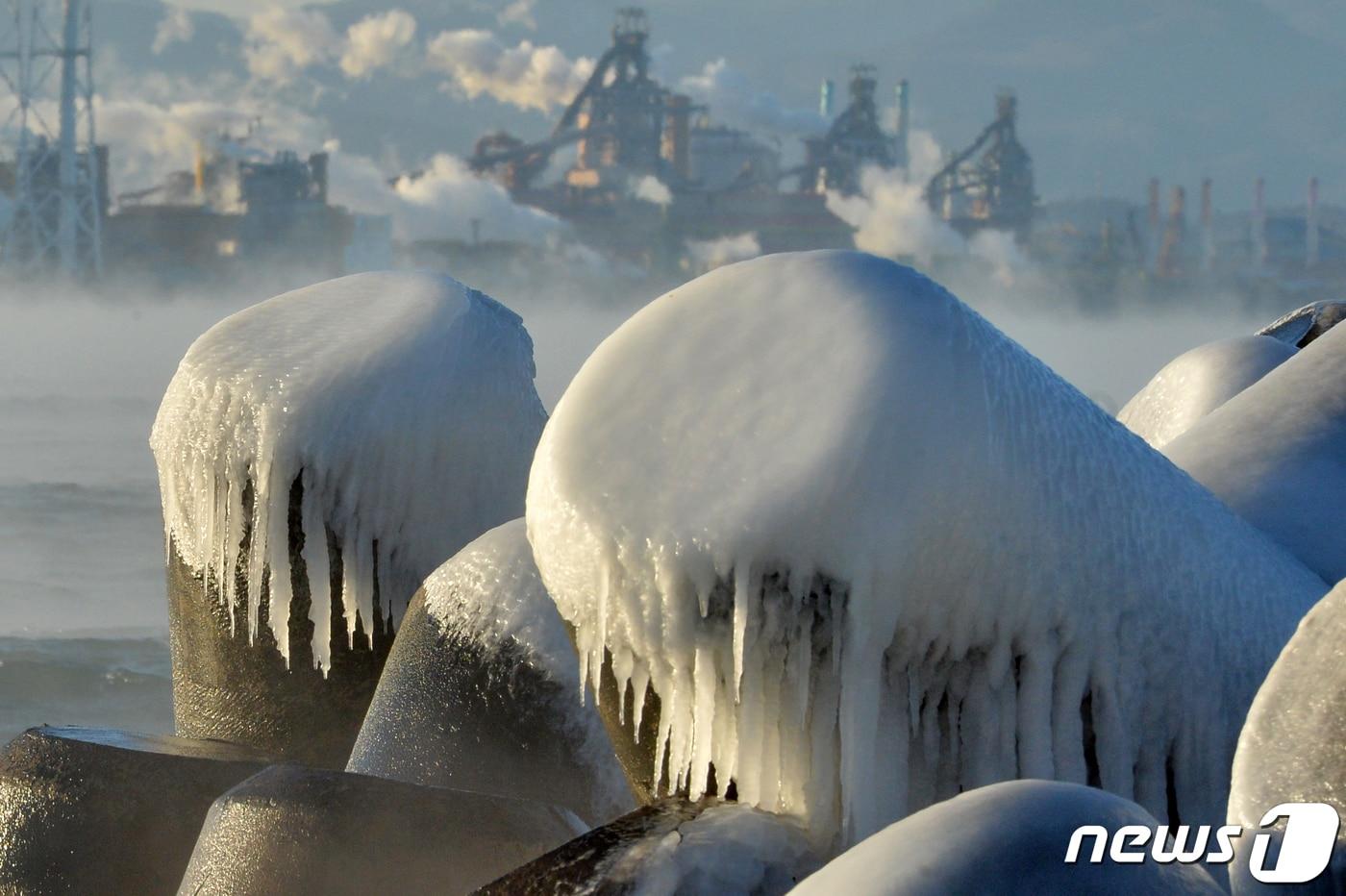 경북 포항시의 아침 기온이 영하 13도(체감 기온 21도)까지 뚝 떨어진 25일 북구 환여동 앞 바다에 설치되어 있는 테트라포드에 고드름이 얼어있다.2023.1.25/뉴스1 ⓒ News1 최창호 기자