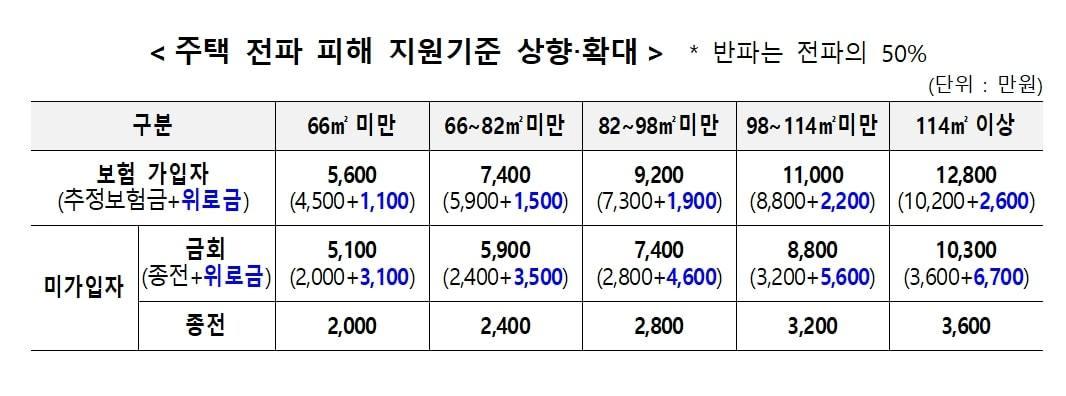 수해 피해 지원 확대…주택 침수 시 지원금 2배로소상공인, 피해보상금 외에 200만원씩 별도 지급주택 전파, 반파 지원기준. (행안부 제공)관련 키워드수해피해호우홍수반지하침수극한호우호우경보강수량관련 기사이승화 산청군수 "재해 복구 끝까지 책임지고 완주"포천 내촌면 농식품부 농촌공간정비사업 선정…사업비 129억 확보서울역사박물관, '1925 을축년 대홍수' 특별전…11월 16일까지수해 겪은 아산시 "국가하천 준설 의무화해야""지난해 수해 입은 北 자강도, 1년여 만에 복구 작업 본격화"