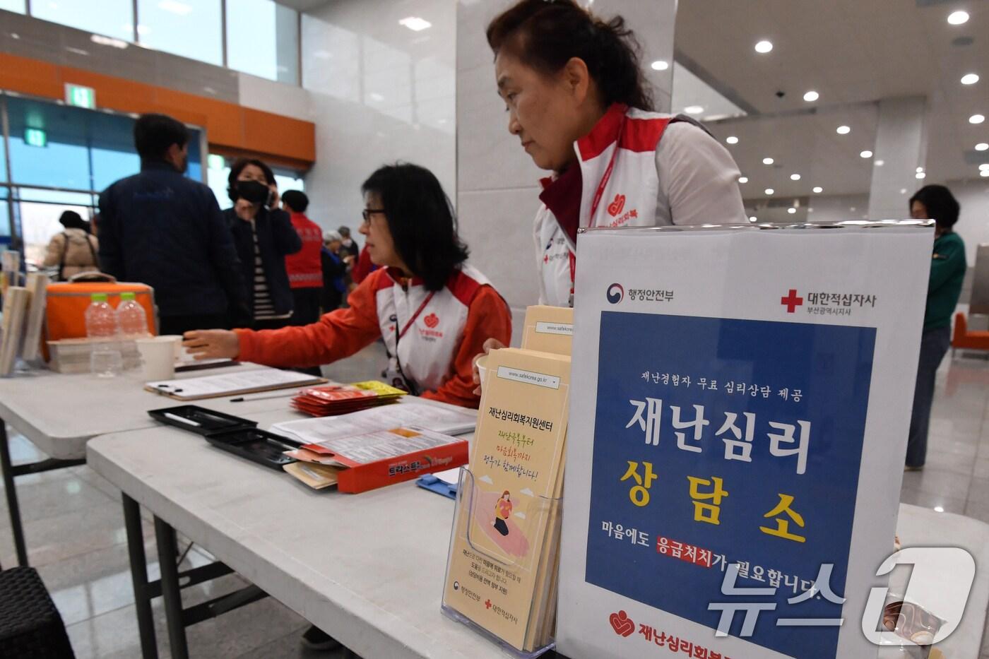 대한적십자사 봉사자들이 27일 오후 경북 영덕군 영덕읍 국민체육센터에서 산불 피해 이재민들의 심리 안정을 위한 재난심리 상담소를 운영하고 있다. 이곳에는 현재 900여명의 이재민이 대피한 상태다. 2025.3.27/뉴스1 ⓒ News1 최창호 기자