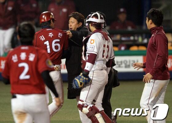 8일 오후 서울 목동야구장에서 2014 한국야쿠르트 세븐 프로야구 넥센 히어로즈와 KIA 타이거즈의 경기가 열렸다.9회초 KIA 김주찬이 몸에 공을 맞은 뒤 마운드를 향해 걸어가자 양팀 선수들이 그라운드로 뛰쳐나와 실랑이를 벌이고 있다. 2014.4.8/뉴스1 © News1 정회성 기자8일 오후 서울 목동야구장에서 2014 한국야쿠르트 세븐 프로야구 넥센 히어로즈와 KIA 타이거즈의 경기가 열렸다.9회초 넥센 손승락이 KIA 김주찬의 몸에 맞는 공을 던진 뒤 미안함을 표시하고 있다. 2014.4.8/뉴스1 © News1 정회성 기자유승관 기자 [뉴스1 PICK]김호철 감사원장 후보자 "외압·압력 막아낼 것"[뉴스1 PICK]장동혁 "30일 본회의 열어 반드시 통일교 특검법 처리"