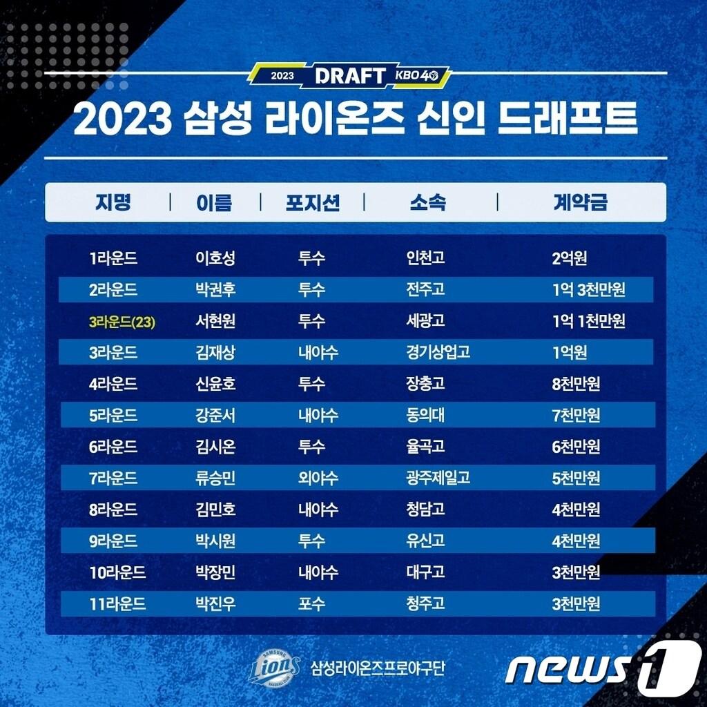신인 12명과 계약 완료(삼성 라이온즈 제공)관련 키워드프로야구삼성권혁준 기자 '파리 올림픽 銅' 근대5종 성승민, 우리금융그룹과 후원 협약'KPGA 4승' 고군택, 2월 9일 입대…"국방 의무하고 돌아오겠다"관련 기사삼성라이온즈 원태인의 '추천 맛집'은?…대구시 유튜브 출연삼성 라이온즈 선수들, 자선행사 수익금 전액 대구 달성군 기부삼성, 스프링 캠프 일정 확정…1차 괌·2차 오키나와서 담금질겨울잠 깬 프로야구, 스프링캠프 시작…다음주부터 릴레이 출국베테랑 불펜 김상수, 롯데 남는다…'1년 총액 3억원' FA 계약